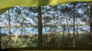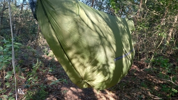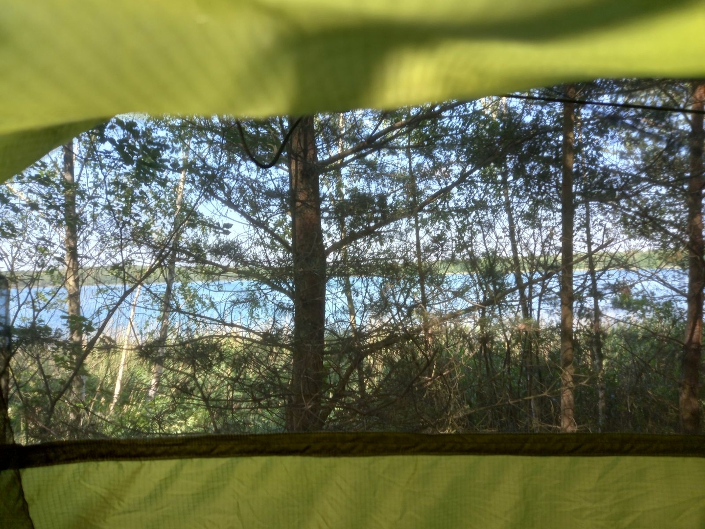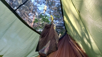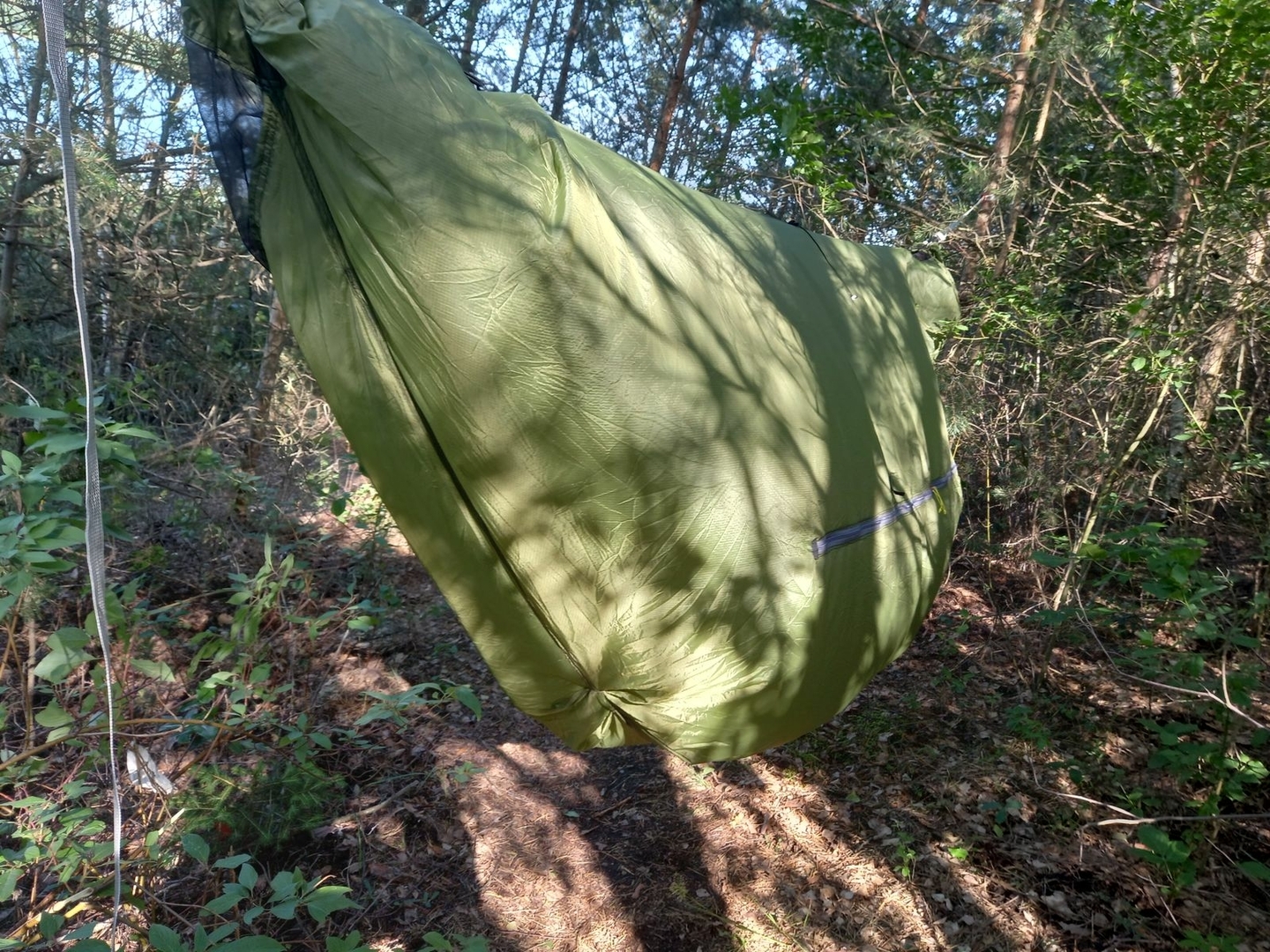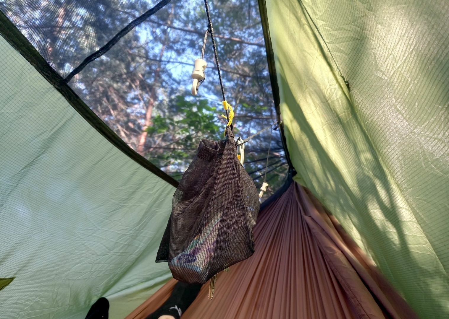 Meine MYOG Windsocke ein großes Netzfenster auf einer Seite. Ich konnte die Ventilation durch die Orientierung der Hängematte zusätzlich beeinflussen. Für mich ist das Gefühl so, als würde man in einem gutbelufteten Innenzelt unter einem Tarp schlafen. Das ist mir viel lieber auf Solotouren und Campingplätzen. Eine Nacht war ich auf einem sehr nassen Festivalcampingplatz wo ich über den Pfützen trocken geblieben bin. Mit dem Netz auf einer Seite und einem horizontalen Reißverschluss auf der anderen, kann ich immer schnell draußen sehen, fall was ist.