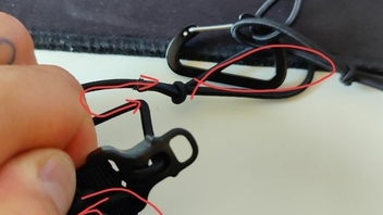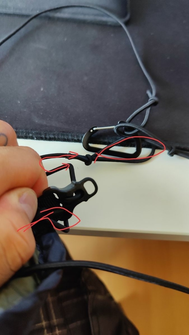 Es ist ganz einfach: wenn du an der einen Schlaufe ziehst, rutscht die Gummikordel durch. Wenn du an der anderen Schlaufe ziehst, arretiert die Gummikordel. Wenn du die richtige Seite gefunden hast, hängst du die Schlaufe an der Seite in den Karabiner ein. Falls die Schlaufe auf der anderen Seite bereits eingehängt ist, häng sie aus. Dieses Ende sollte lose sein.
