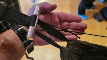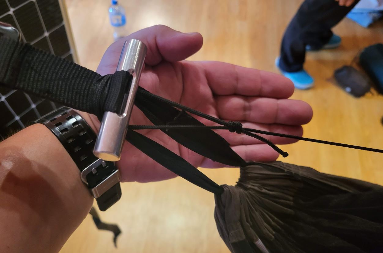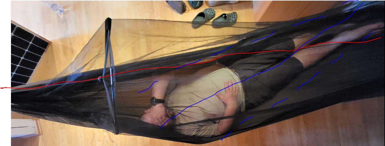 Also habe ich die original "Ridgeline" entfernt, und meine neue "optimal" gefundene Liegeposition mittels "starrer" Ridgeline fixiert. Im Grunde nur eine Polyesterschnur mit 95kg Reißfestigkeit, und 2 Schlaufen an den Enden, die ich in die T-Straps mit einhänge. Sub-Optimal, aber ich hatte nix anderes da.