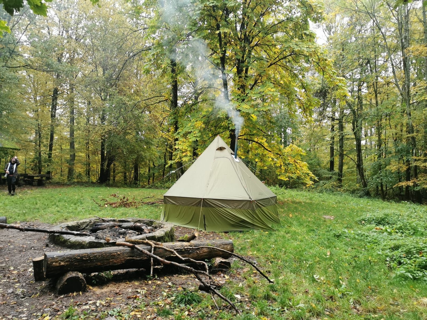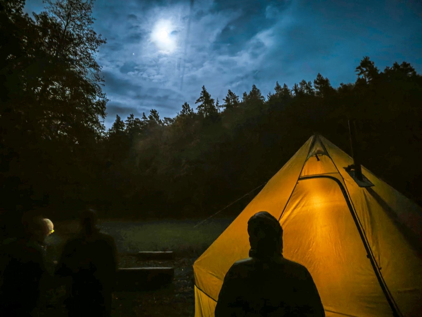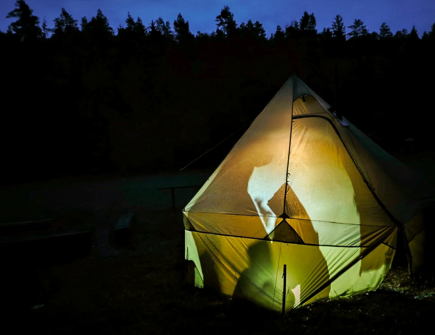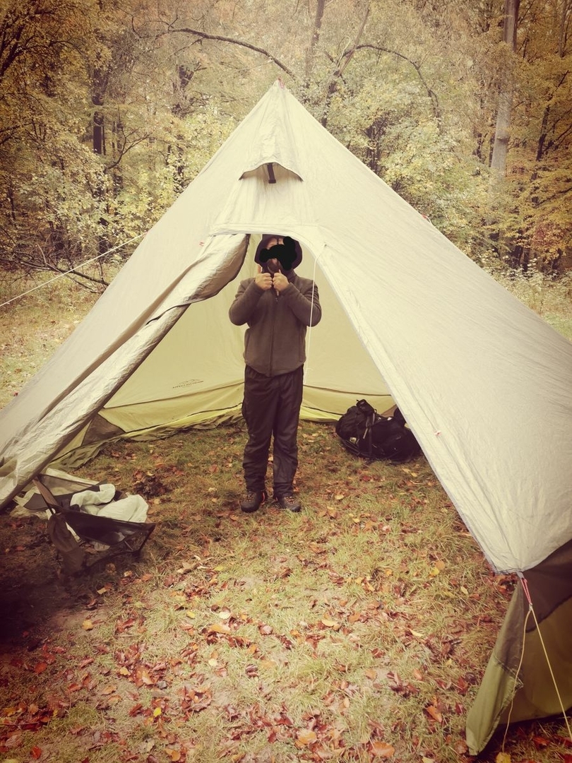 Gekauftes Tippi Zelt mit 4 Meter Durchmesser, aber von 2 Meter Höhe auf 3 Meter getuned. Wiegt jetzt 2,4 Kilo und es passen kuschelig 10 Leute rein. Angenehm mit Rucksäcken waren wir zu acht jetzt drin gesessen.
