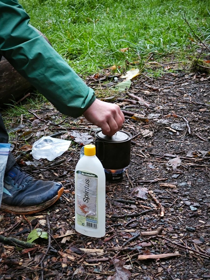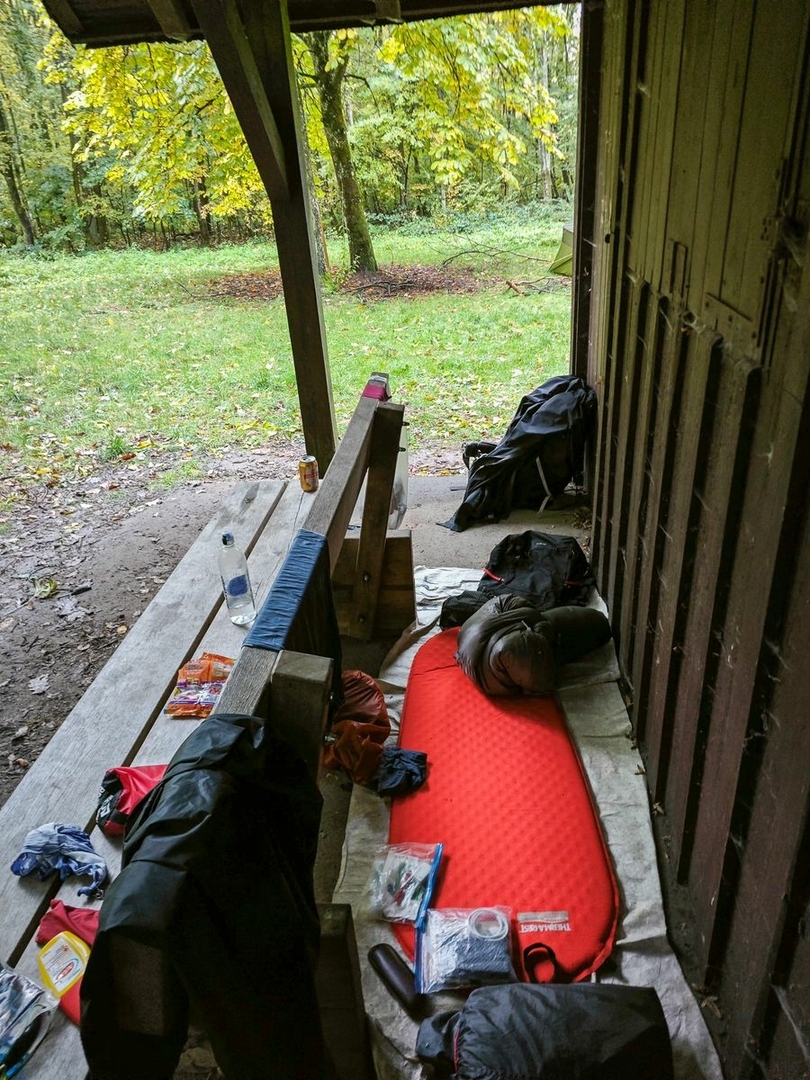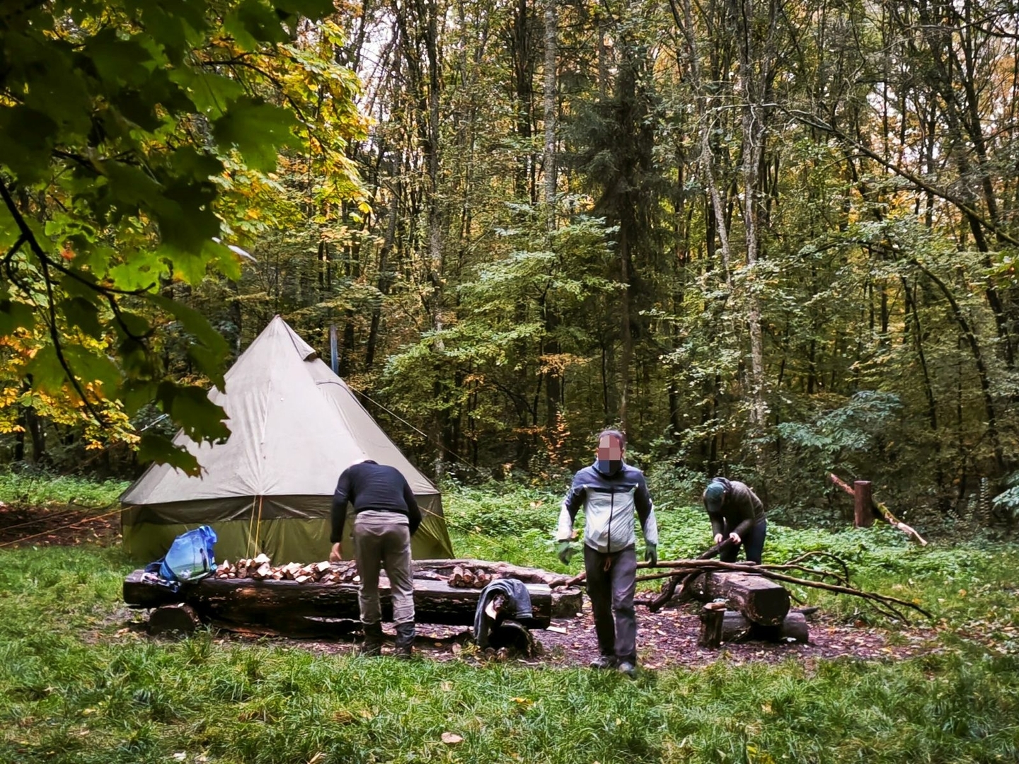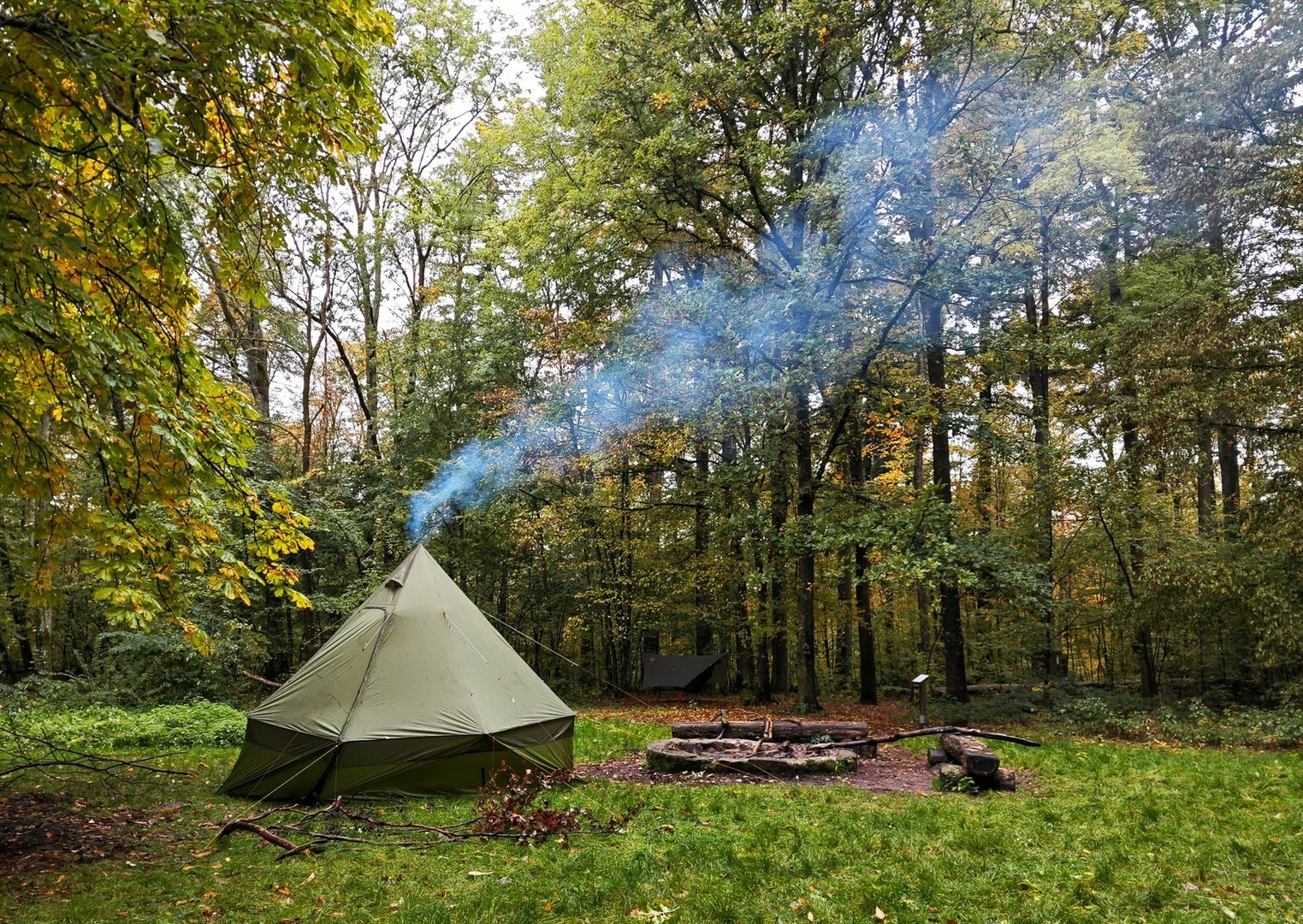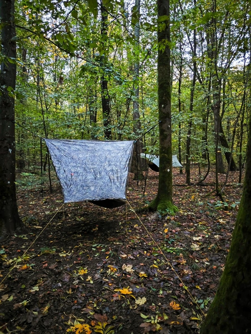 Gekauftes Tippi Zelt mit 4 Meter Durchmesser, aber von 2 Meter Höhe auf 3 Meter getuned. Wiegt jetzt 2,4 Kilo und es passen kuschelig 10 Leute rein. Angenehm mit Rucksäcken waren wir zu acht jetzt drin gesessen.