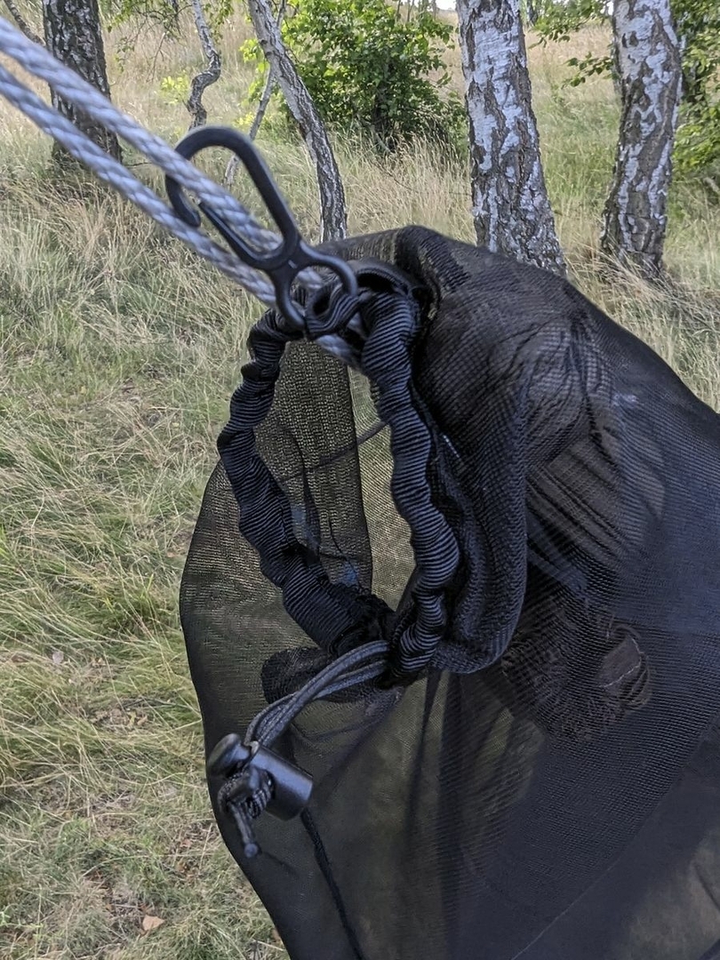 Das 15D Material mit 0,2 mm Stärke hat ca. 200 Löcher pro cm². Am Ende ging es aber auch darum möglichst leicht zu bleiben, was den Ausschlag für das Produkt gab. Das 360 Grad Netz wird über die integrierte Ridgeline der Hängematte gezogen und dann mit zwei Kordelstoppern an den beiden Hängemattenenden festgezogen, so dass dort auch keine Krabbeltierchen hineinkommen. Zusätzlich gibt es jeweils einen Kunststoffhaken, mit dem das Netz z.b. an den Continuous loops befestigt werden kann, damit es nicht verrutscht.