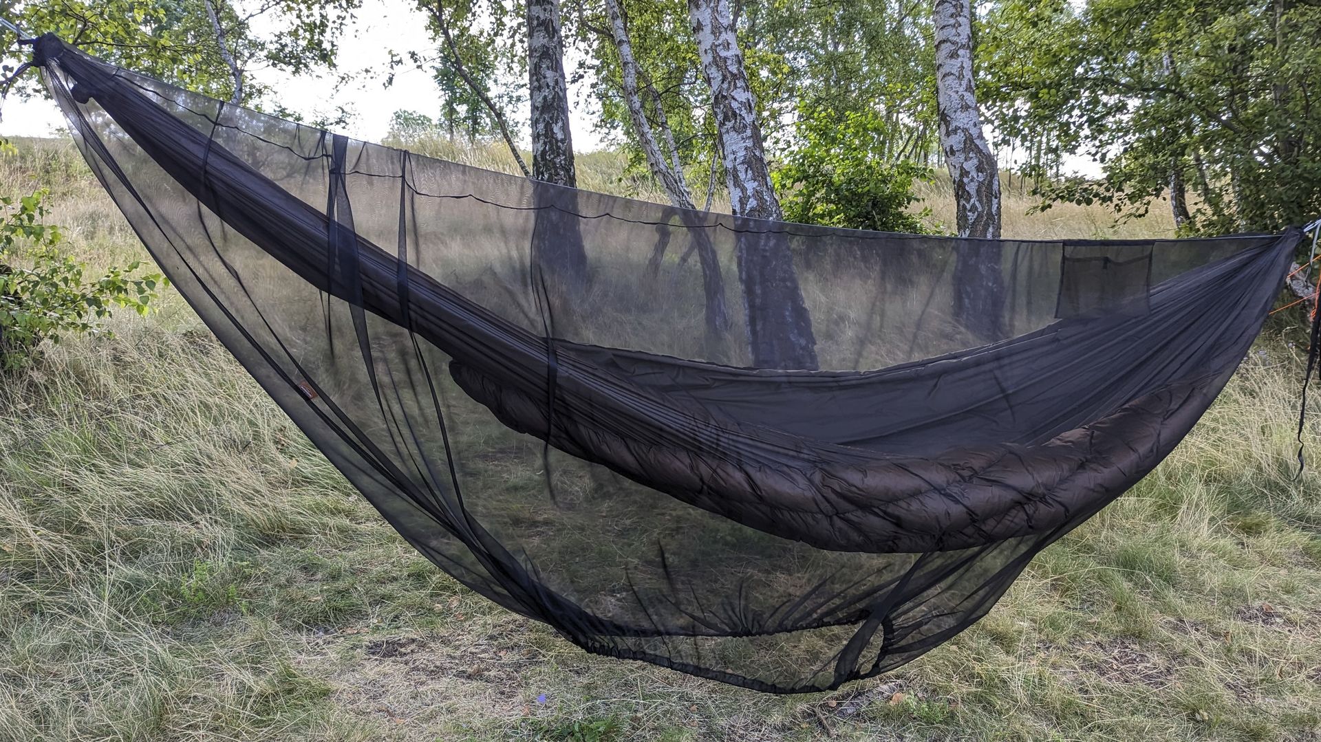 Die Kombination des Netzes mit einer 10,5' Hängematte war beim ersten Versuch unproblematisch. Dass das Netz etwas größer als diese ist, scheint zunächst (und wie erhofft) keine größeren Nachteile mit sich zu bringen. Und man bleibt bzgl. der Mattengröße flexibel.