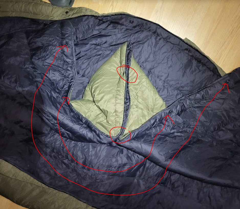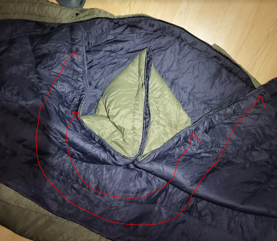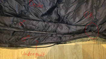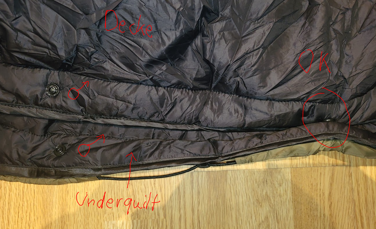 - Decke passt nicht in Underquilt, denn die Decke hat männliche und weibliche Druckknöpfe, während der Underquilt nur männliche hat