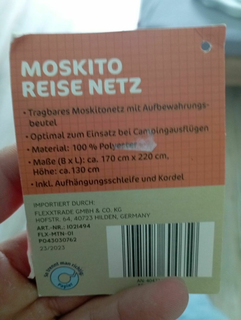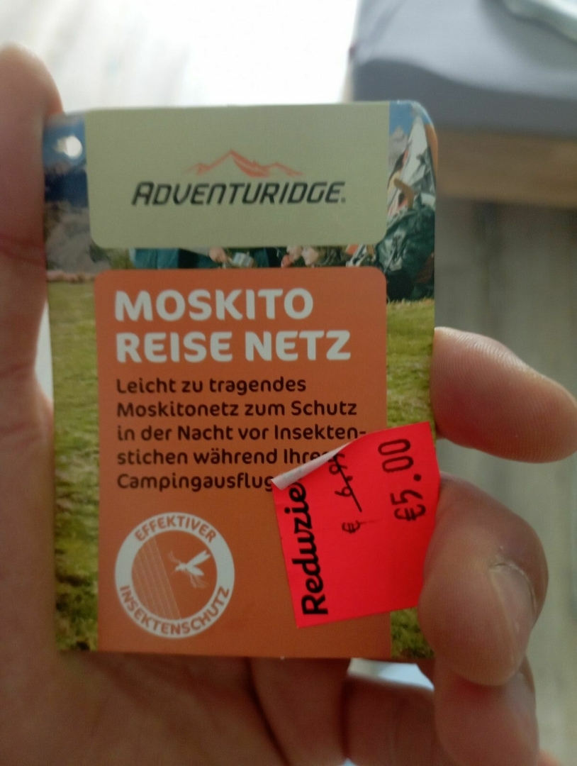 Also habe ich vor ein paar Tagen beim Einkaufen im ALDI ein Moskitonetz der Marke adventureridge gekauft. Es hat nur 5 Taler gekostet und so dachte ich mir, das nehme ich mal mit. Mal sehen, was sich damit machen lässt 😉
