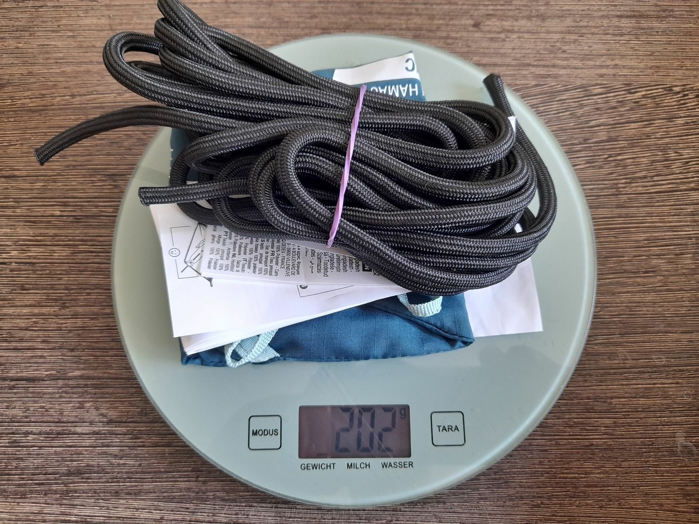 Lässt man die Seile und Tasche weg und schneidet auch das "Heft" an Etiketten raus, hat man das Gewicht für alternative Gurte schon mal wieder drin.
