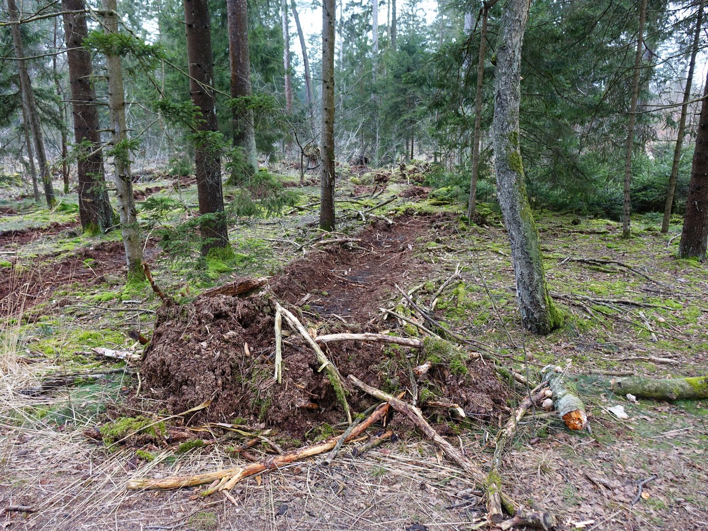 Da wurde alle paar Meter mit einer Baggerschaufel oä. die obere Bodenschicht zum Weg hin zusammengekratzt.
