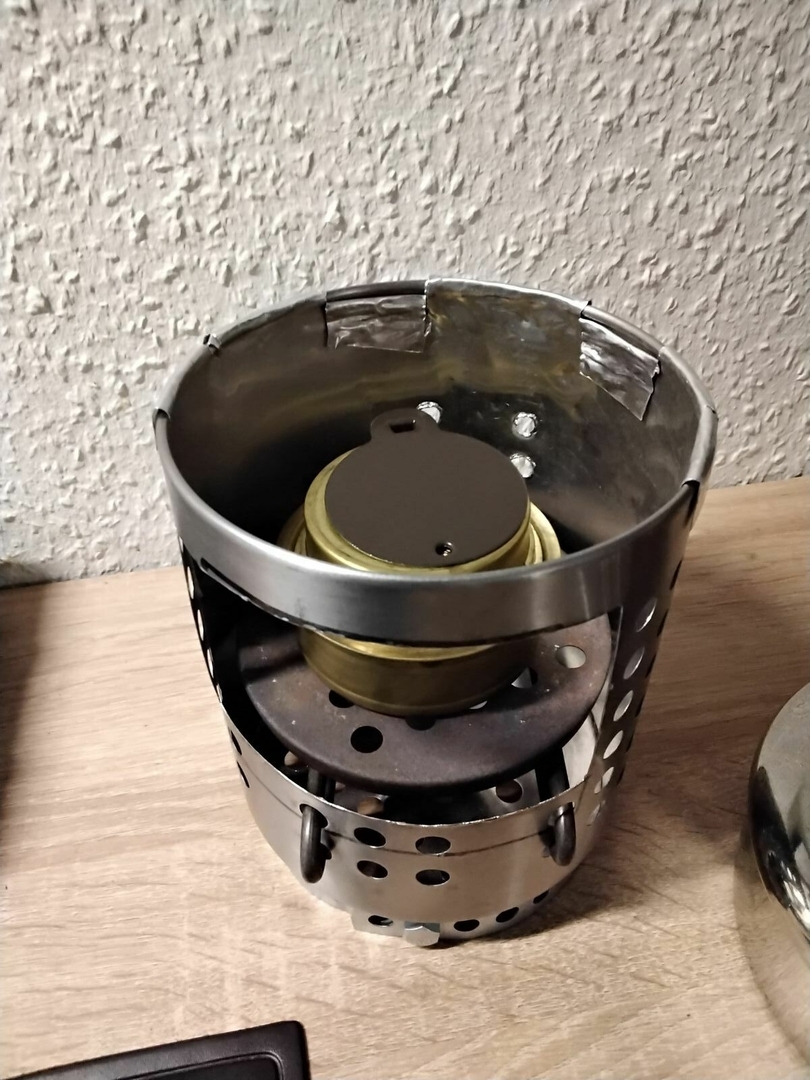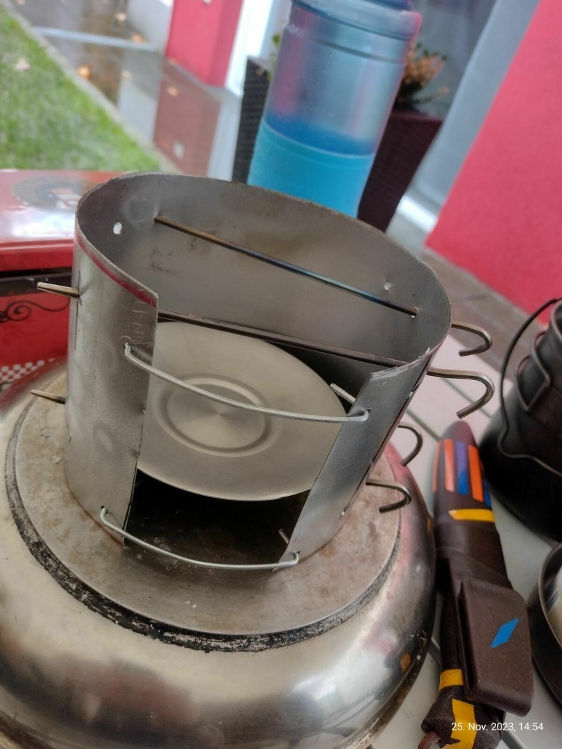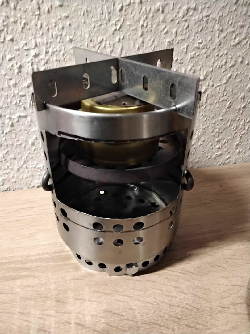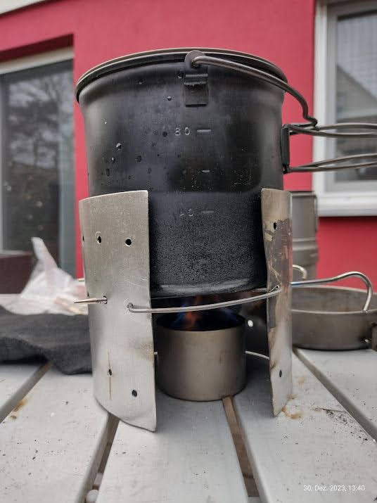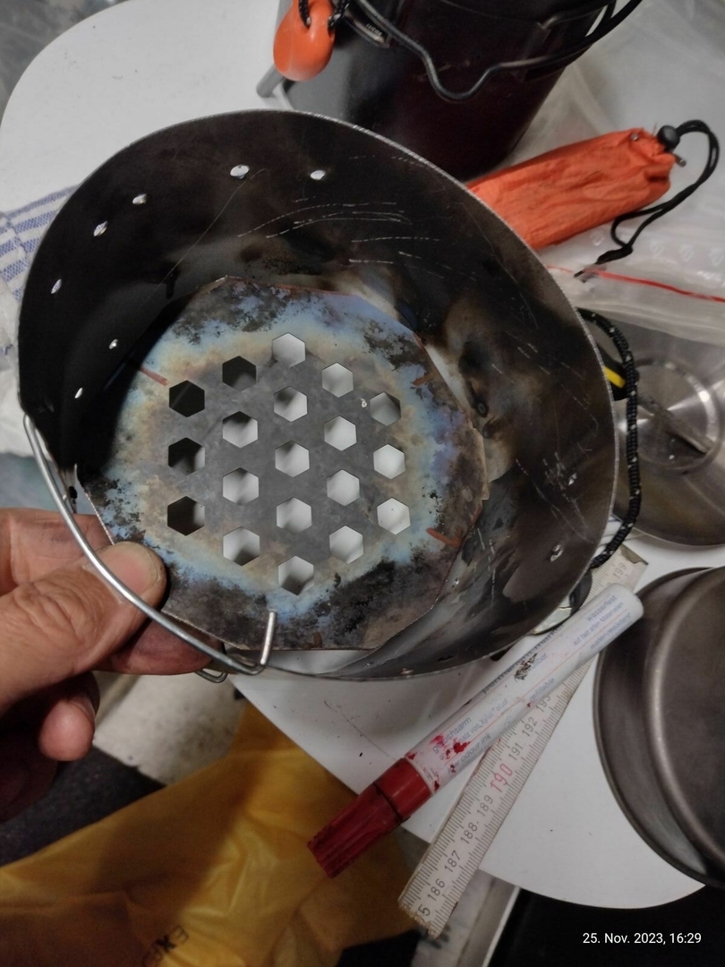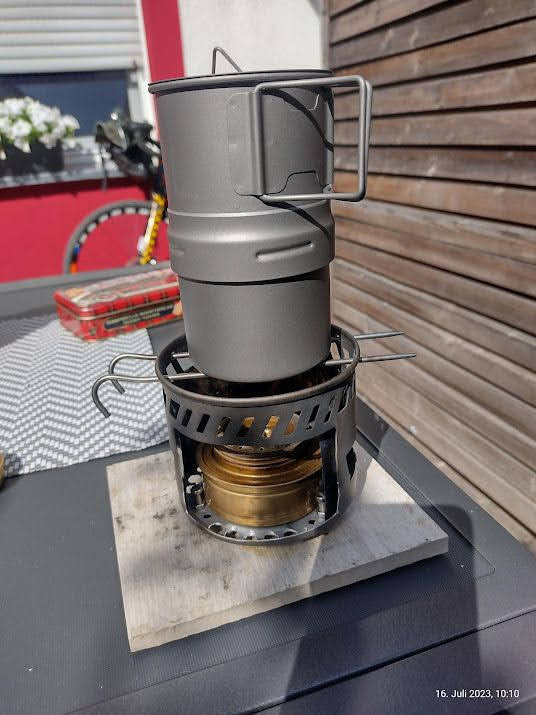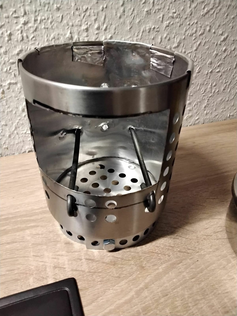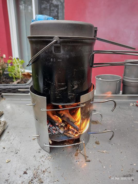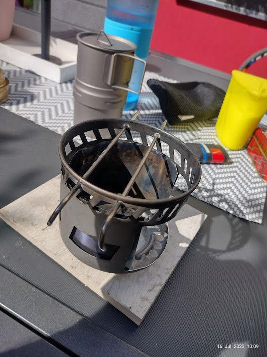 Vier Toaks Heringe und eine Edelstahl Untertasse für den Brennholzbetrieb. Auch ja, die Fixierhalterungen sind ex Fahrradspeichen.