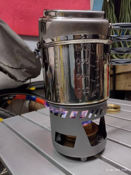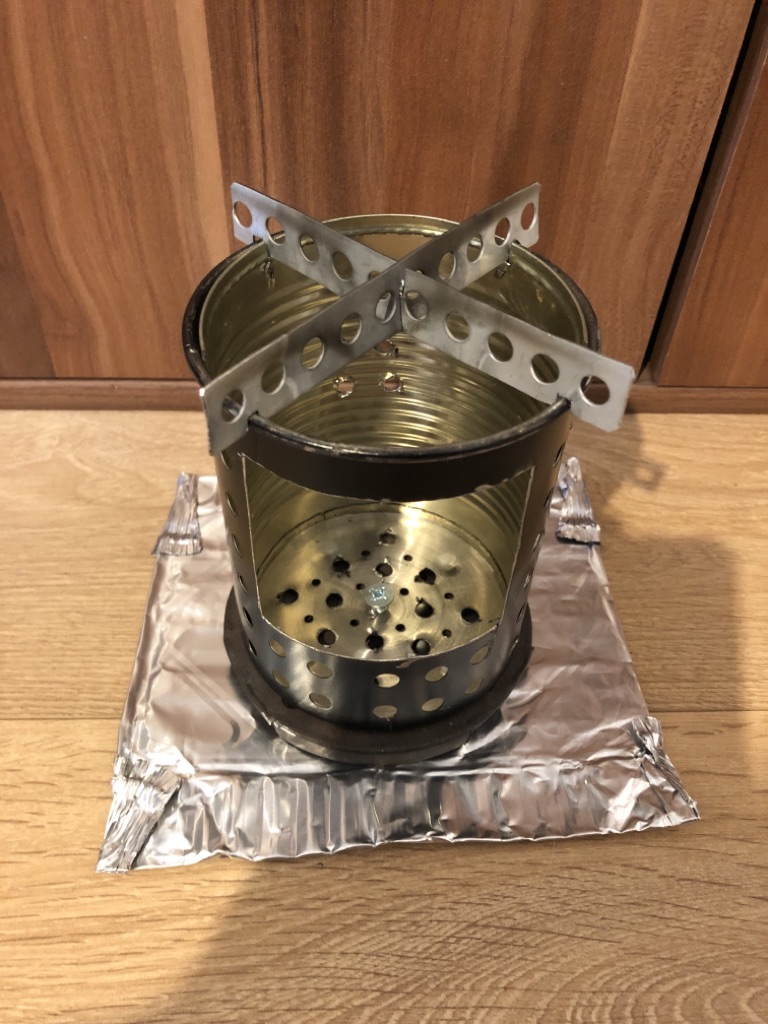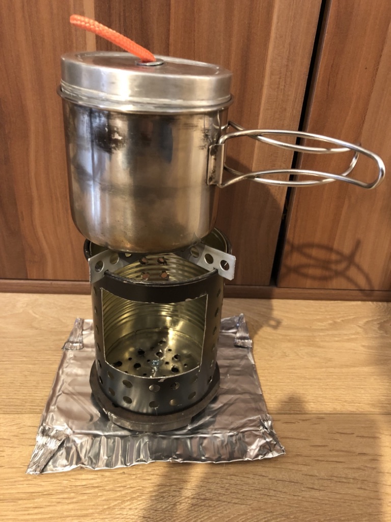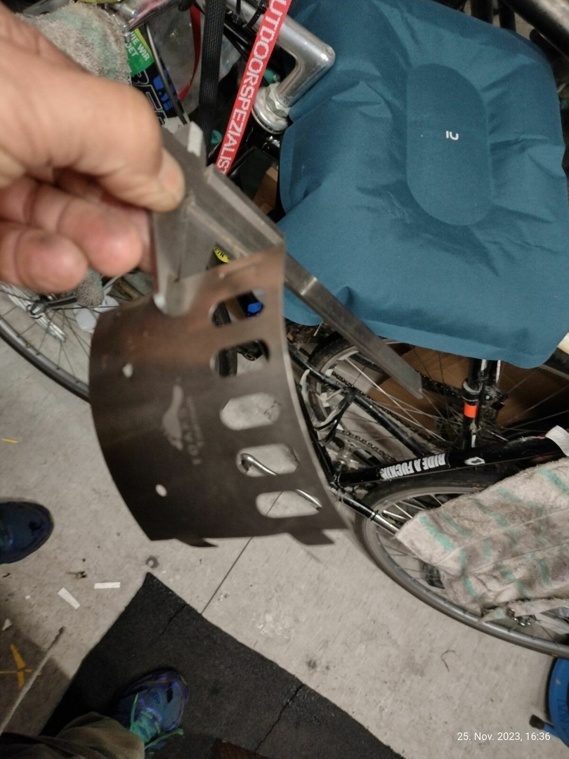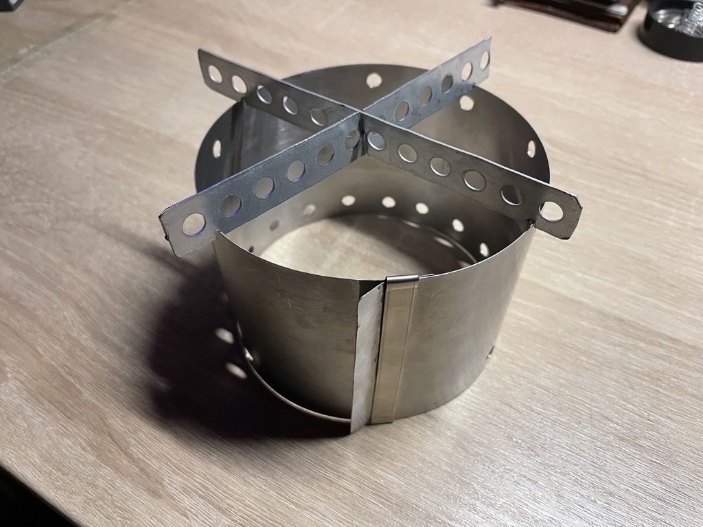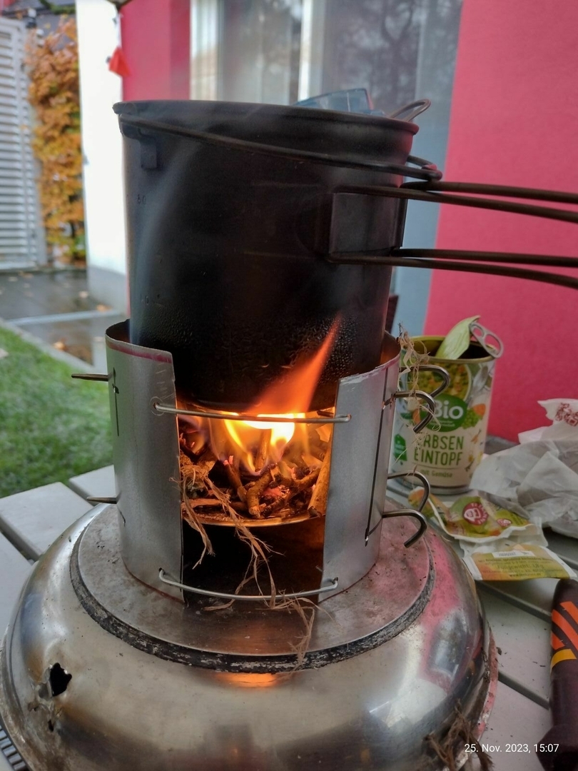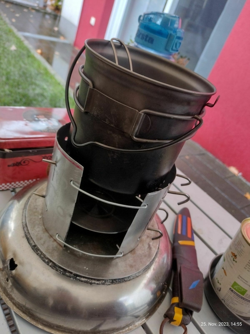 Vier Toaks Heringe und eine Edelstahl Untertasse für den Brennholzbetrieb. Auch ja, die Fixierhalterungen sind ex Fahrradspeichen.