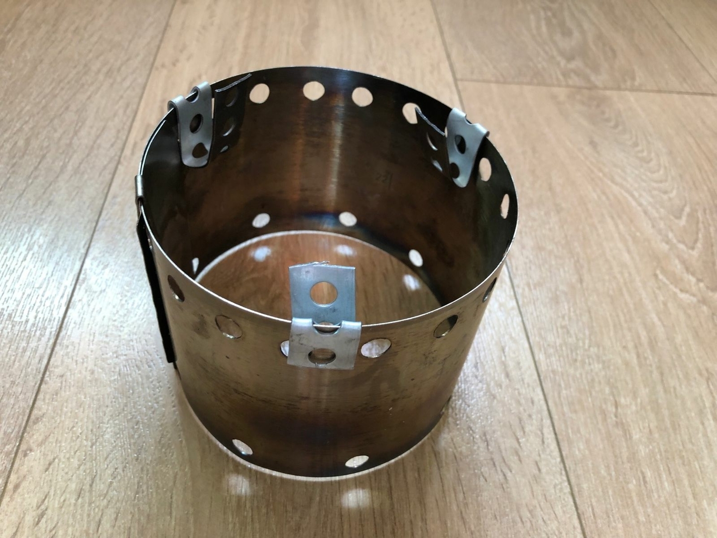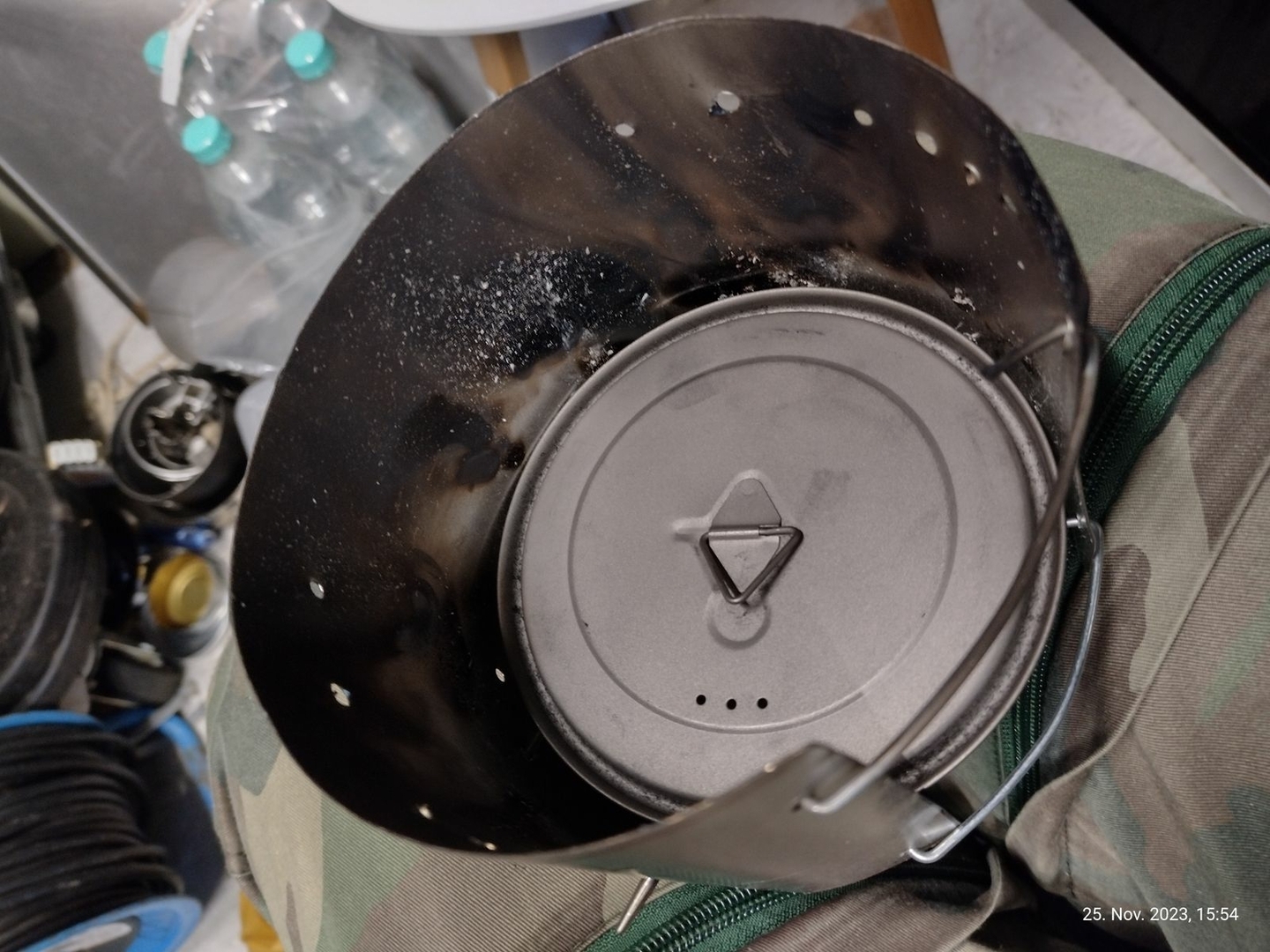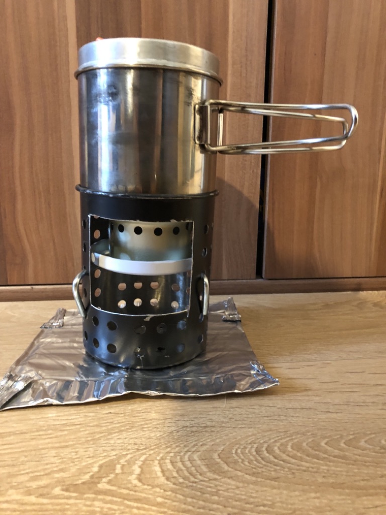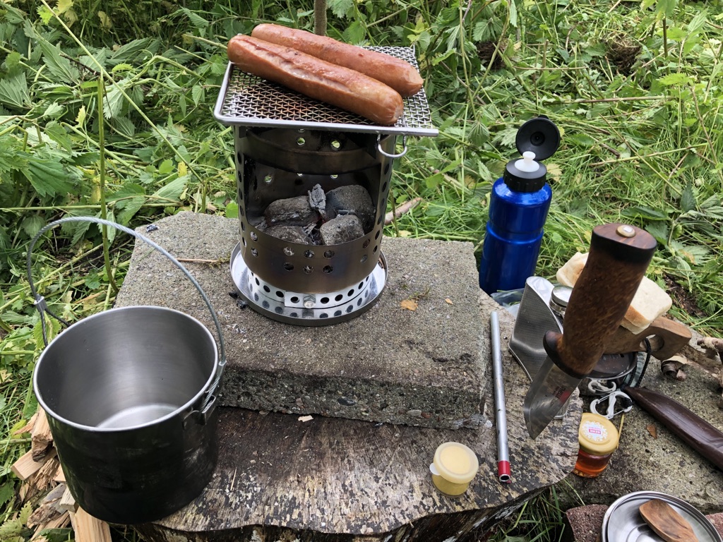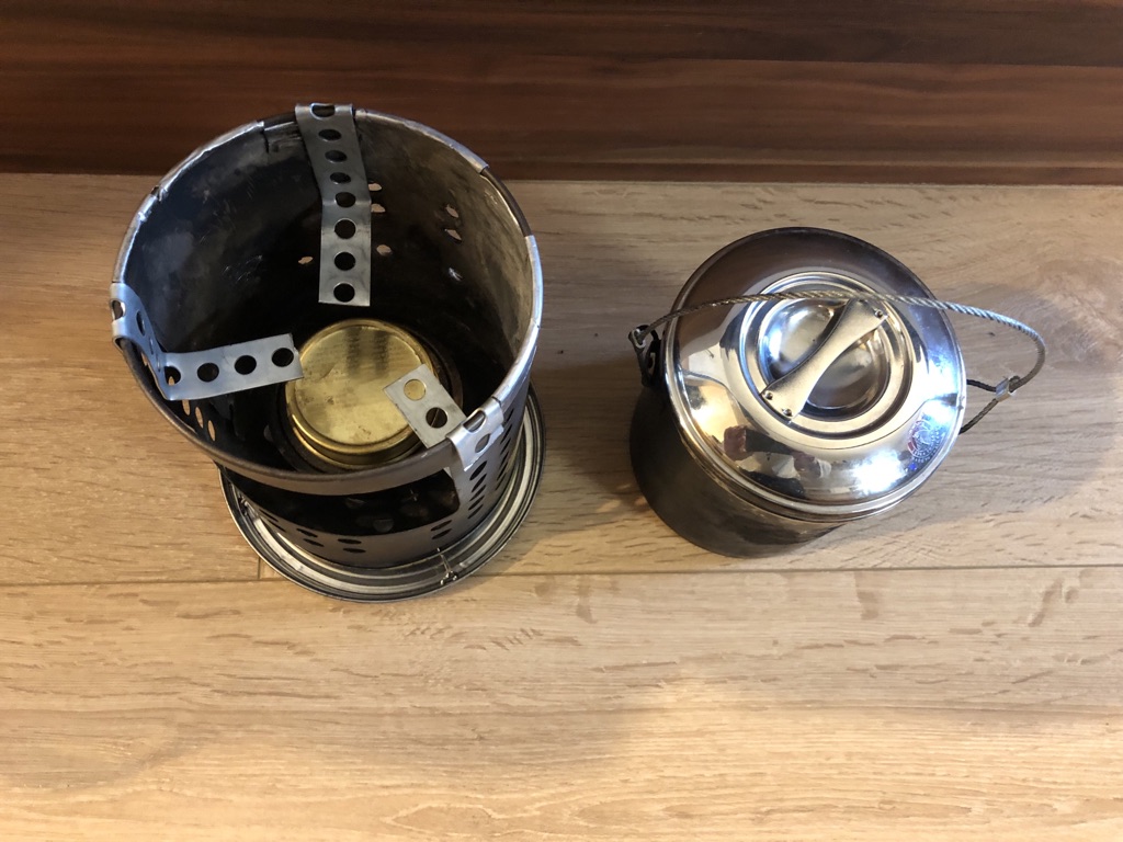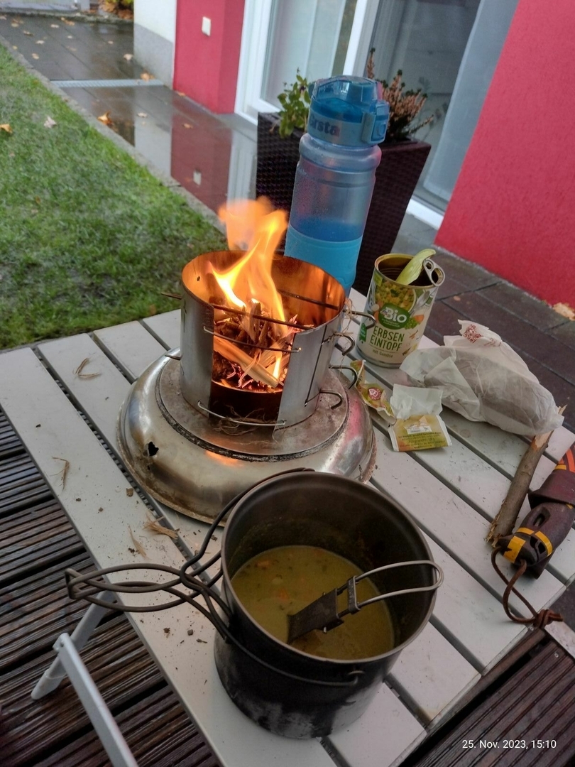 Vier Toaks Heringe und eine Edelstahl Untertasse für den Brennholzbetrieb. Auch ja, die Fixierhalterungen sind ex Fahrradspeichen.