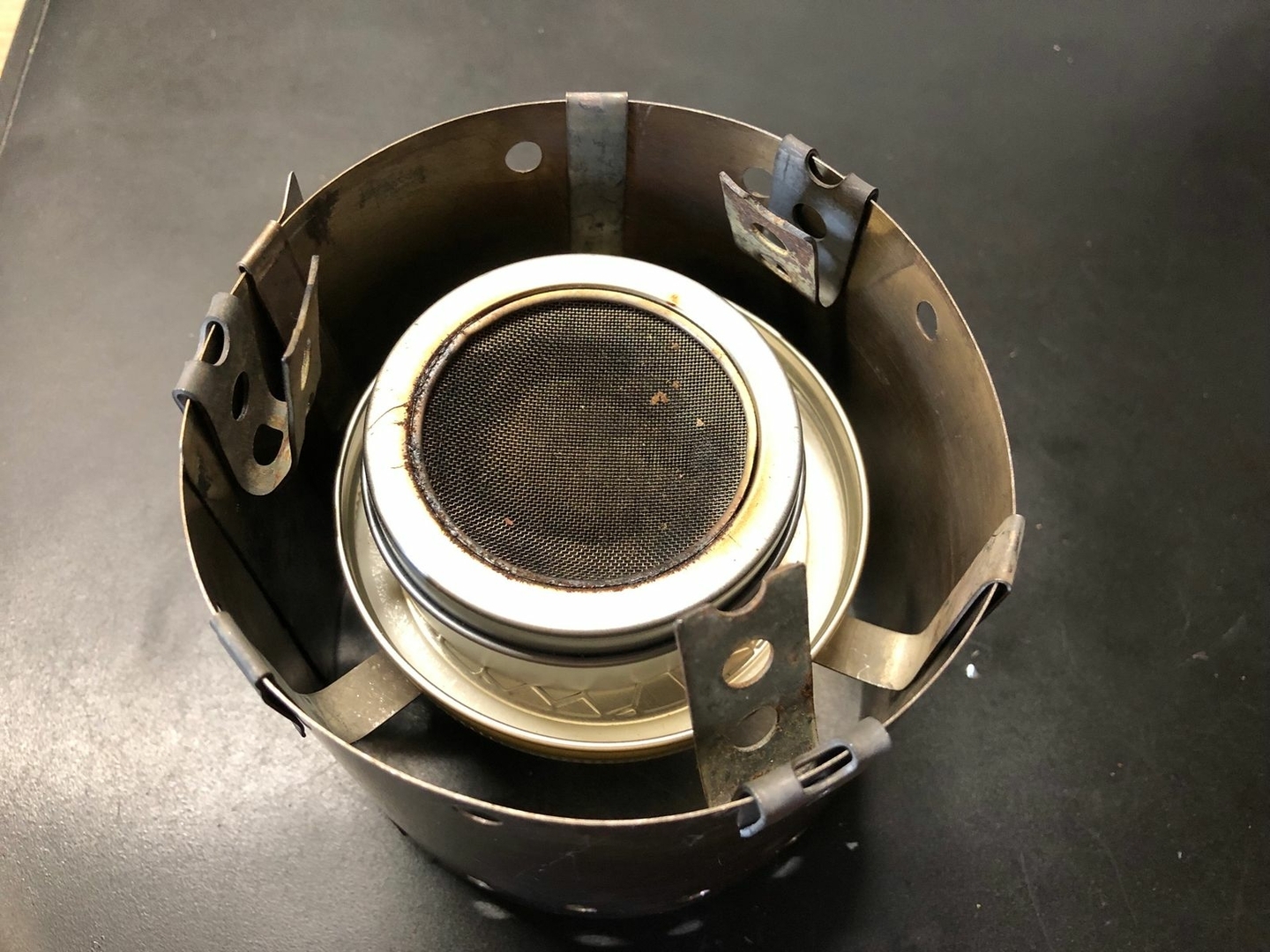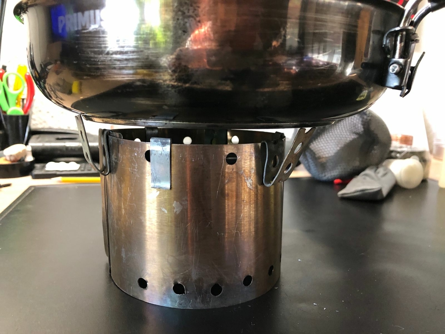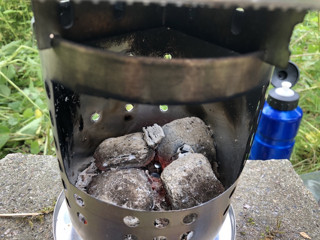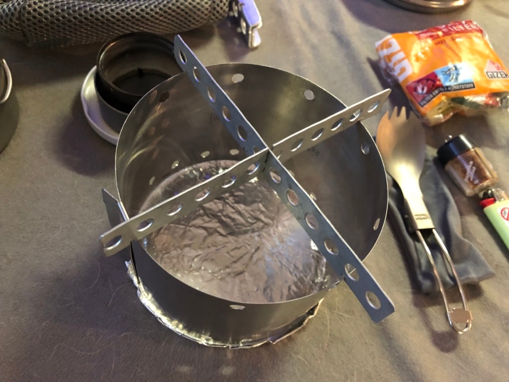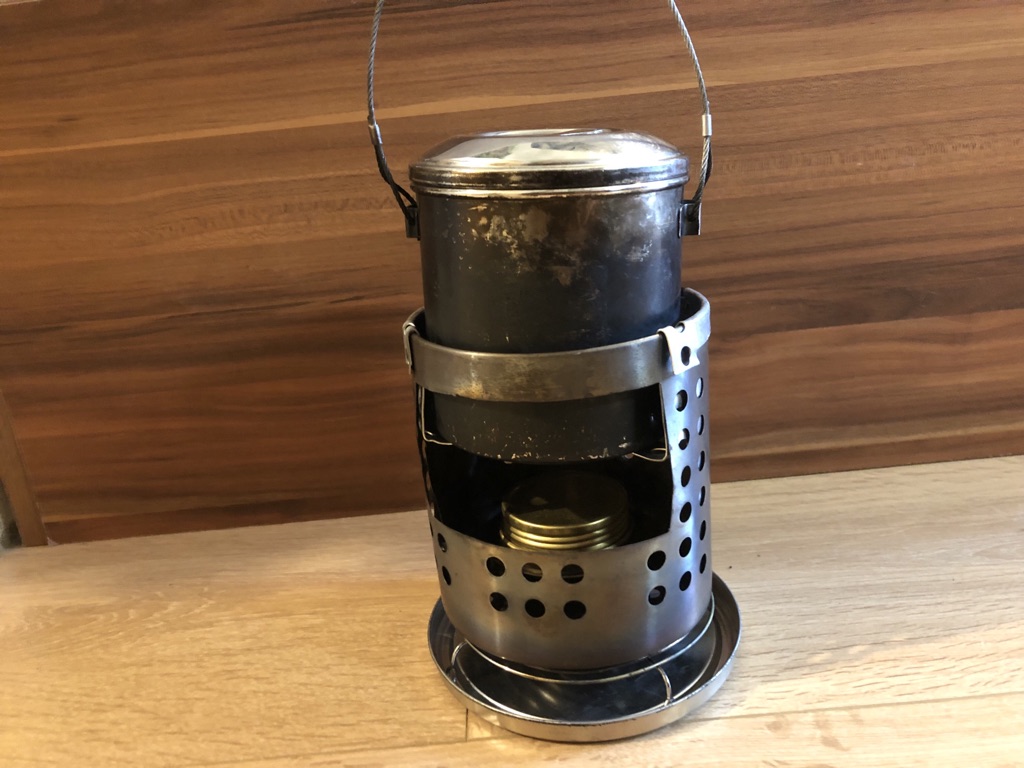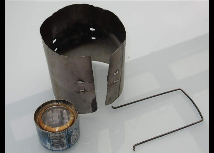 Vier Toaks Heringe und eine Edelstahl Untertasse für den Brennholzbetrieb. Auch ja, die Fixierhalterungen sind ex Fahrradspeichen.
