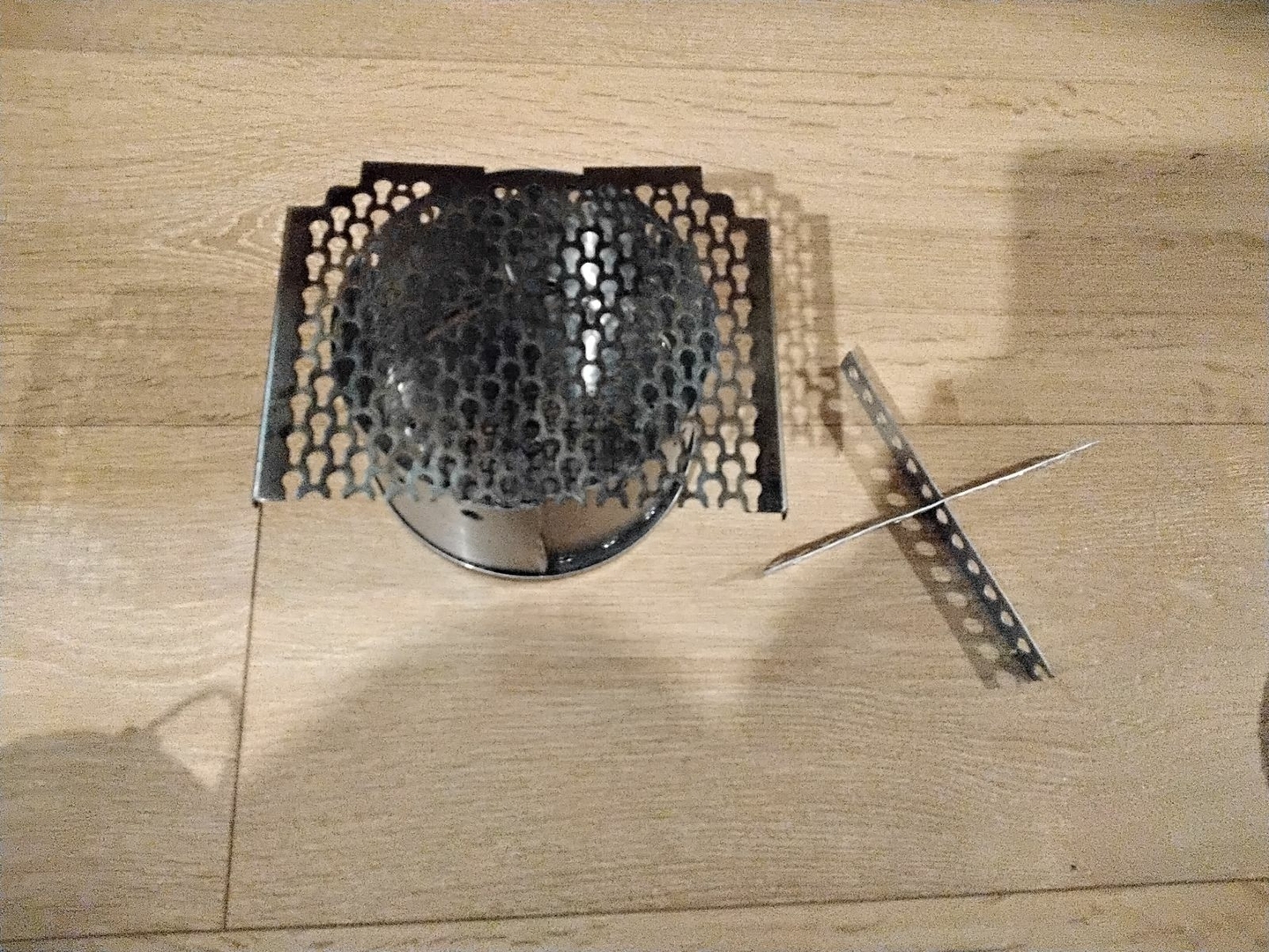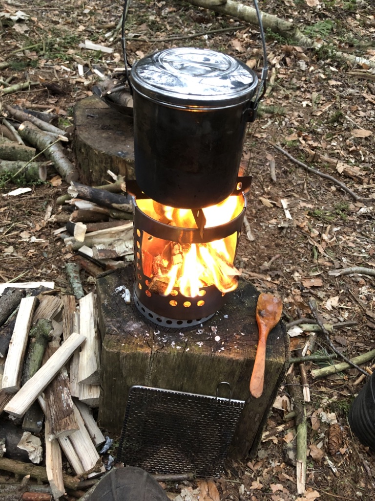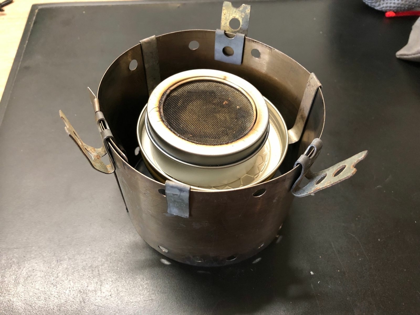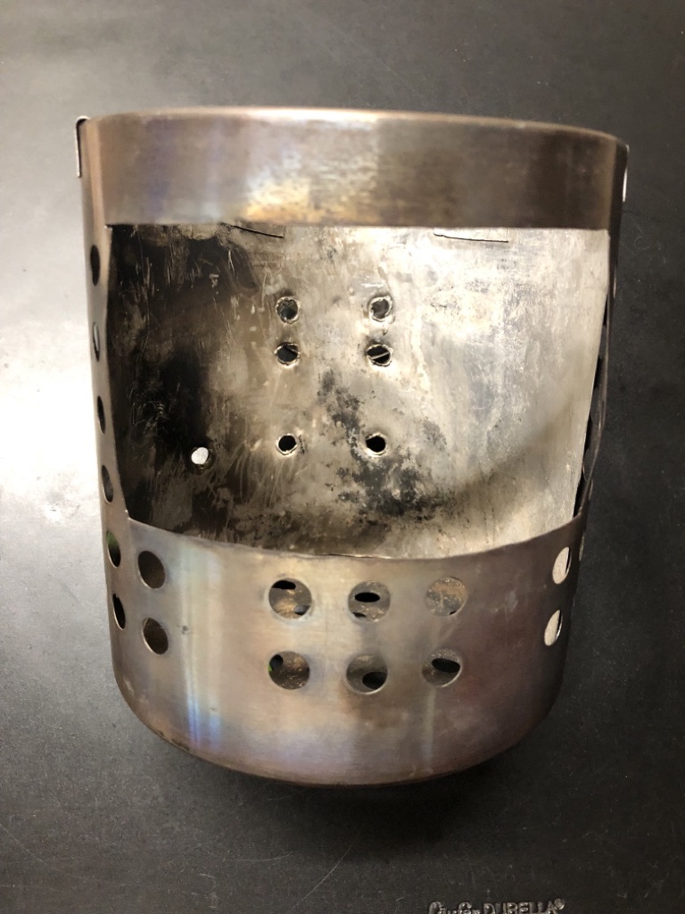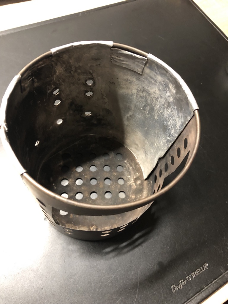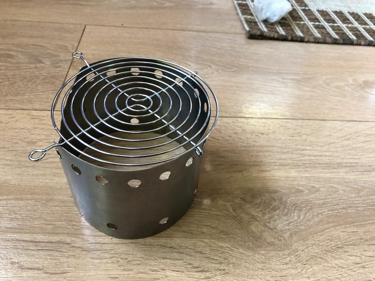 Vier Toaks Heringe und eine Edelstahl Untertasse für den Brennholzbetrieb. Auch ja, die Fixierhalterungen sind ex Fahrradspeichen.