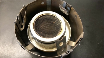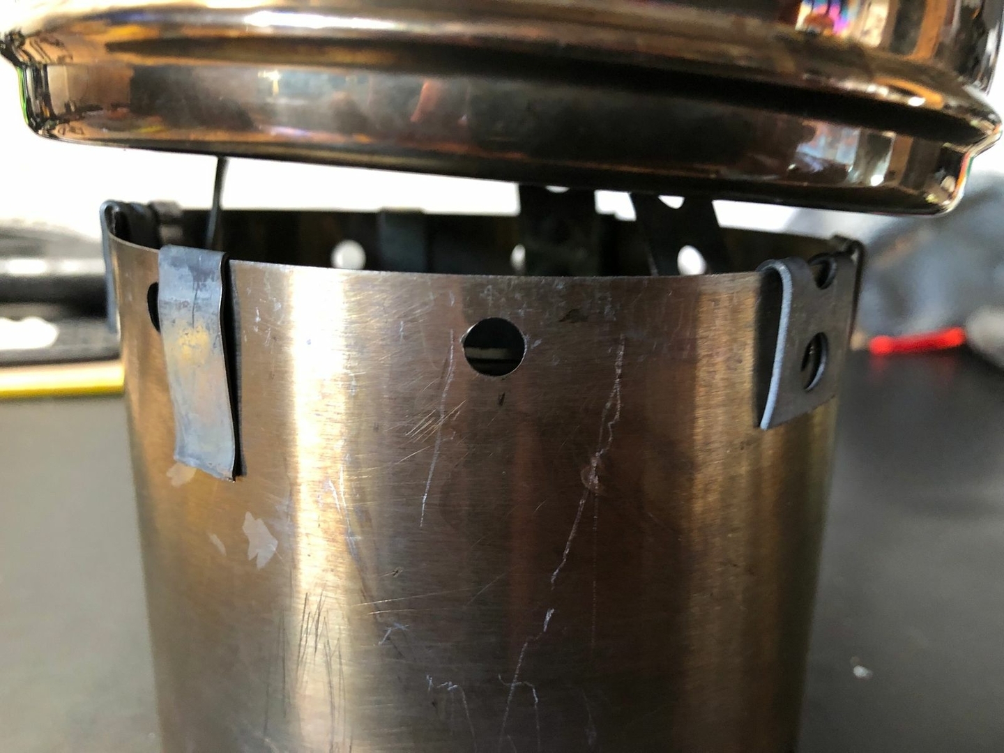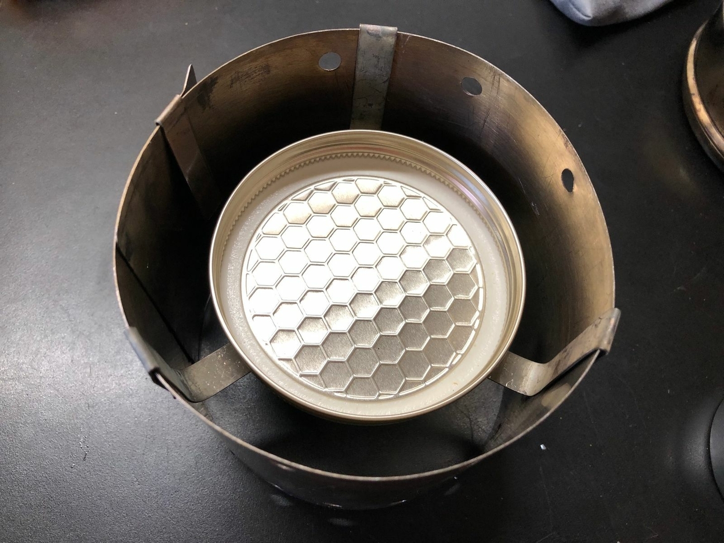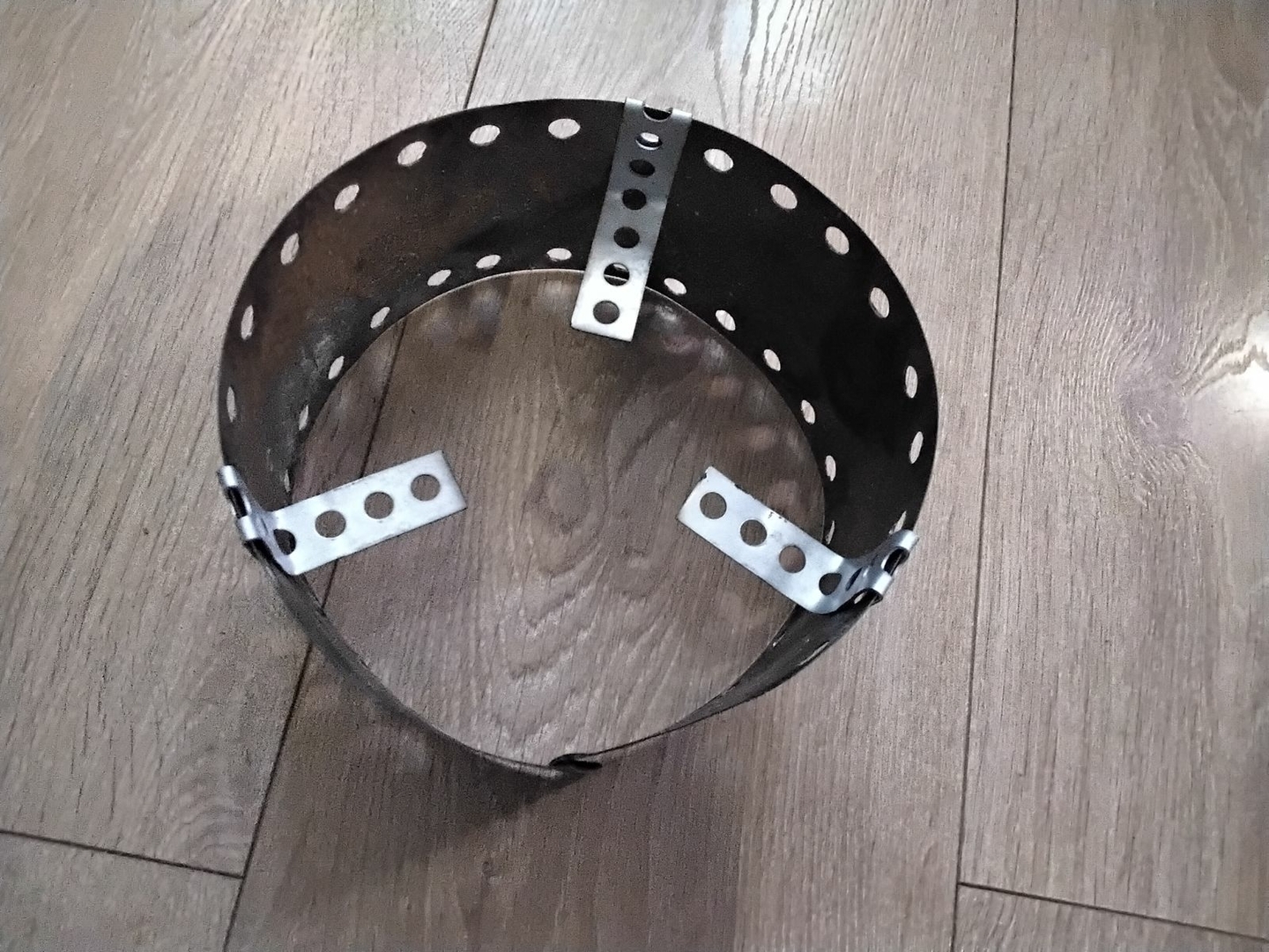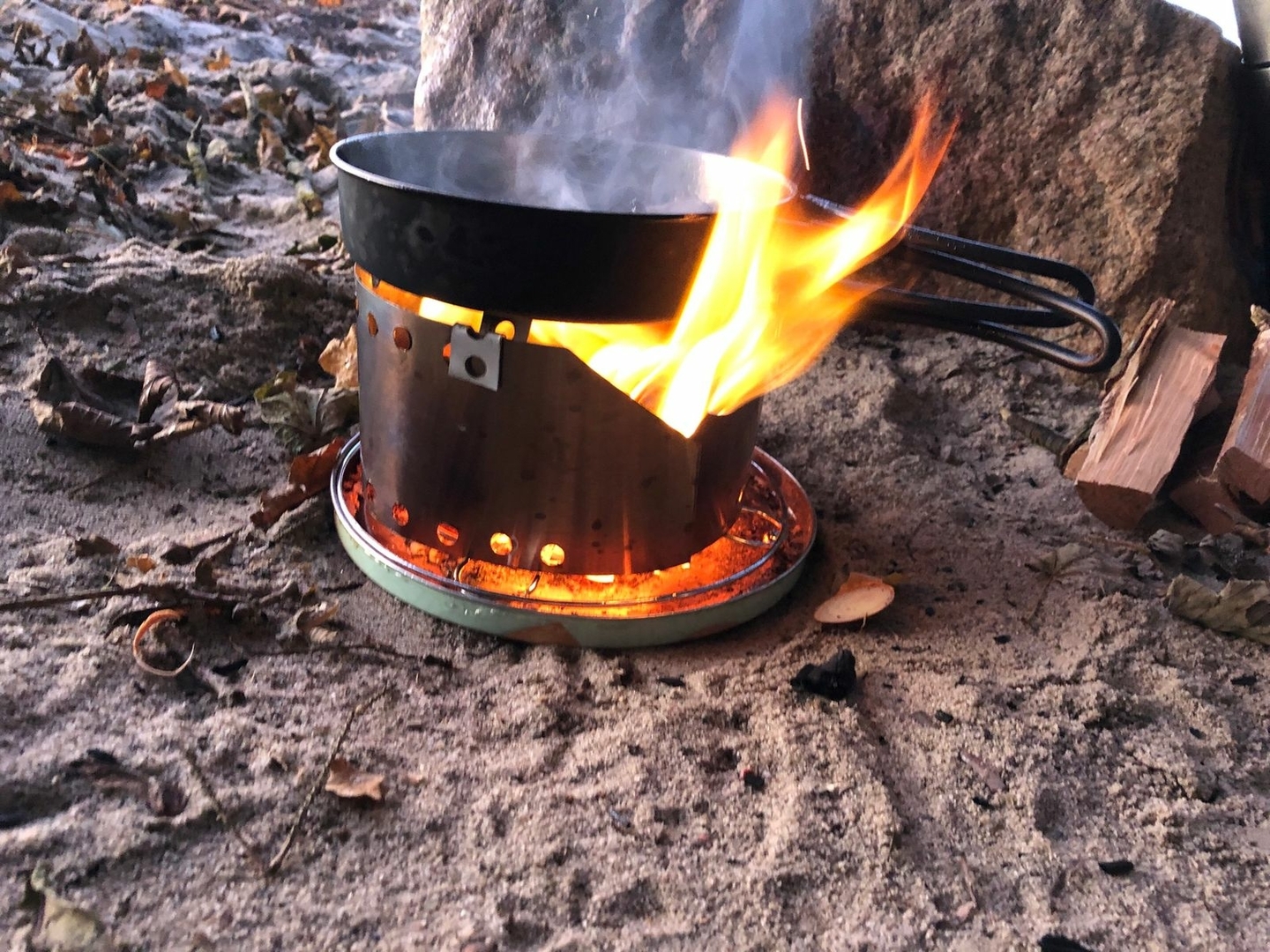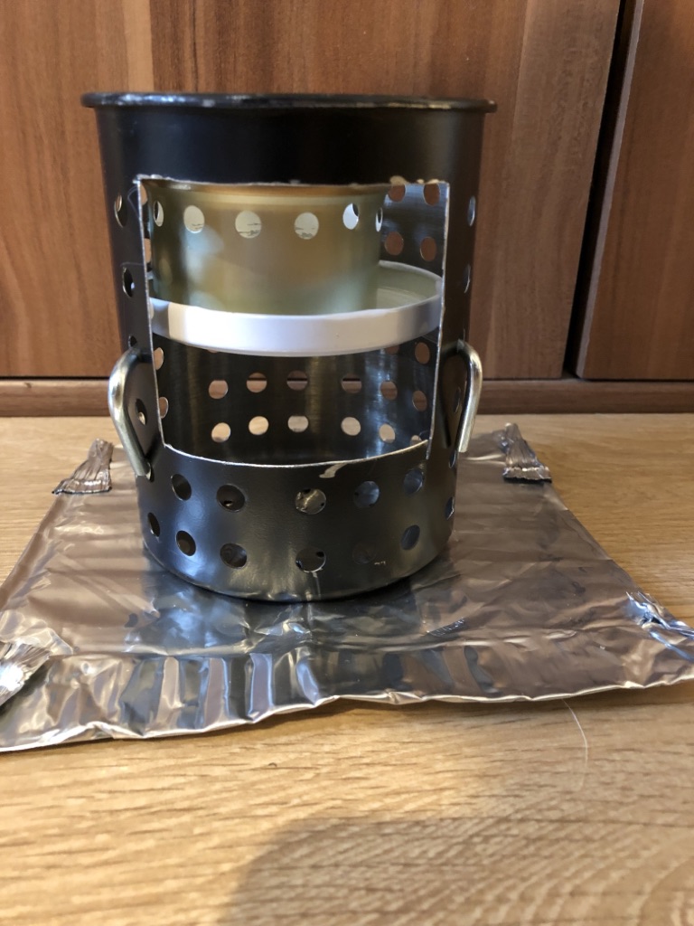 Vier Toaks Heringe und eine Edelstahl Untertasse für den Brennholzbetrieb. Auch ja, die Fixierhalterungen sind ex Fahrradspeichen.