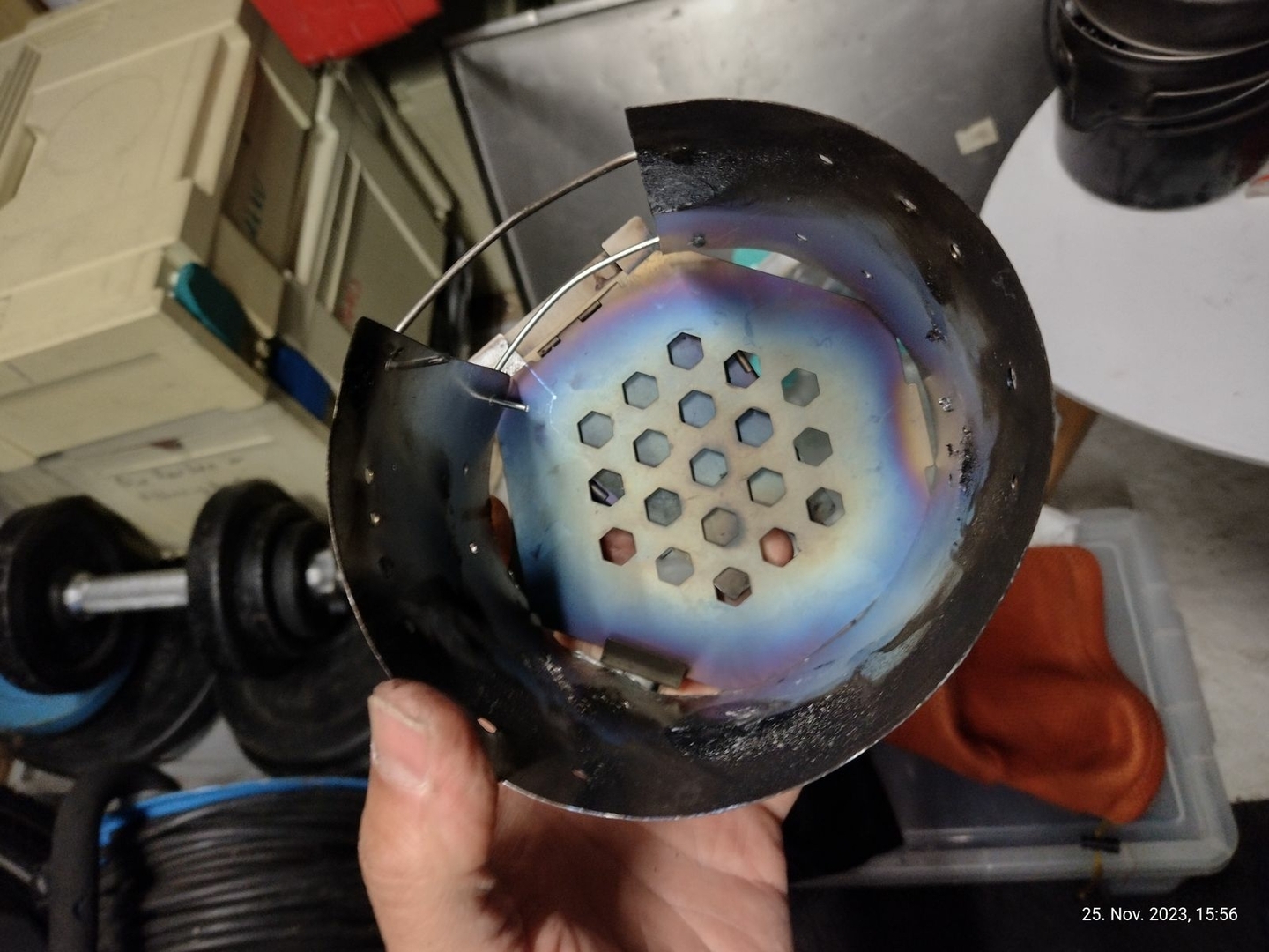 ...macht das auch gut was her. Der Brennteller, also die ehemalige Untertasse, könnte noch ein Stück nach unten. Ich schätze mal um die Hälfte.