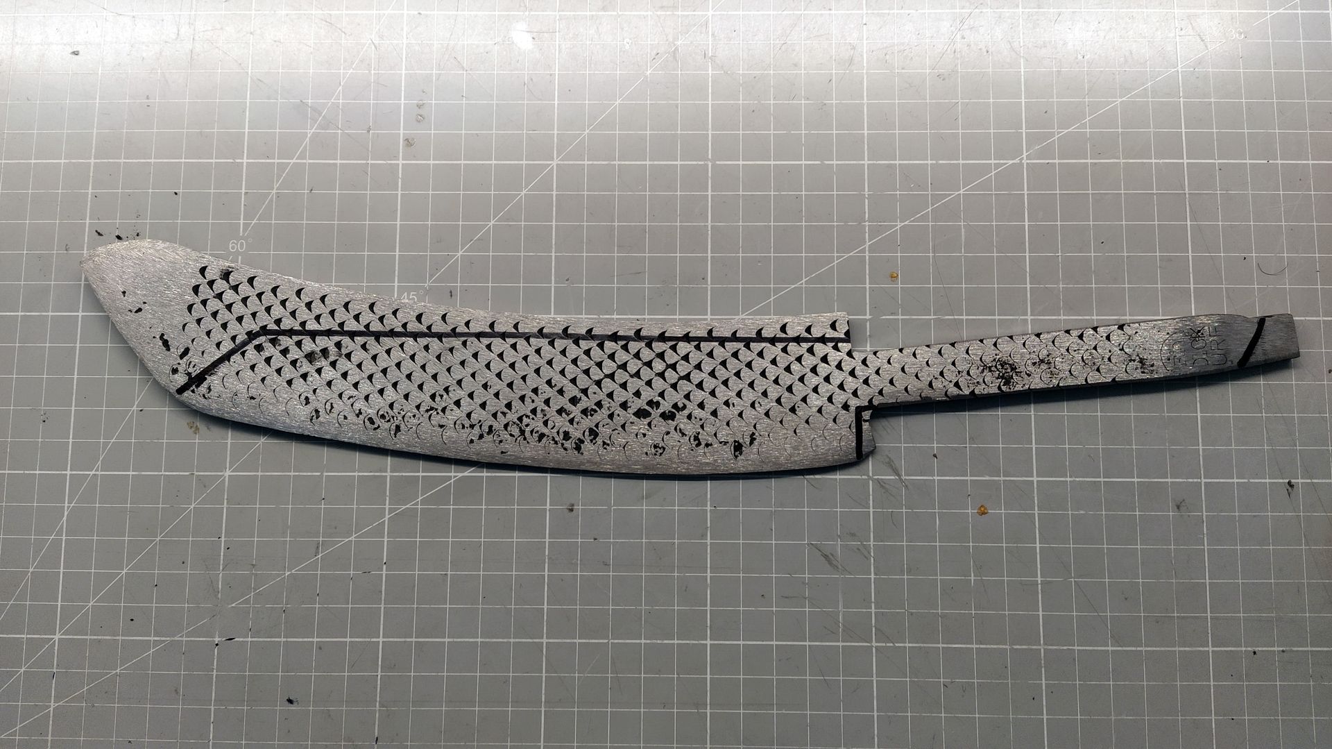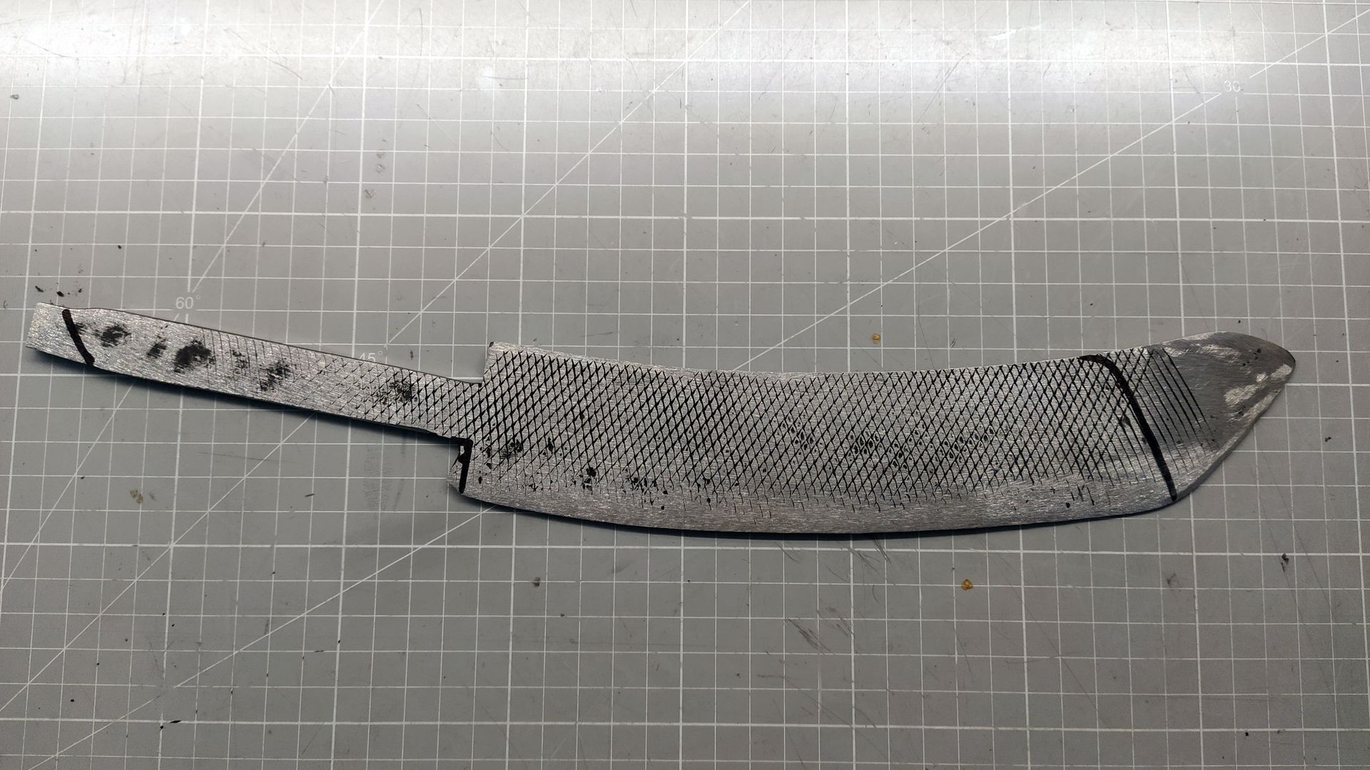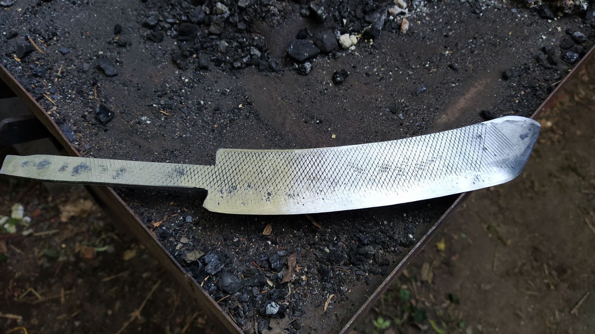 • Beim treiben der Schneide mit dem Kugelhammer treibt man das Material in eine (natürliche) Biegung. Der Schmiedemeister meint, das kann man natürlich alles korrigieren, aber 3,5 Stunden? vergiss es. Wir sind nicht bei Forged in Fire.