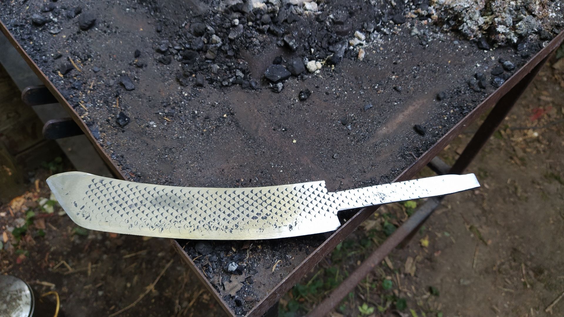 Bei einem so dünnen Material wie einem Messer hast Du wenn mal 1 Minute Zeit für das Schmieden, bevor sich die Farbe von gelb auf rot ändert und dann heißt es wieder ab ins Feuer. Das dauert dann gefühlt 7 - 10 Minuten, bis das Werkstück wieder Temperatur hat.
