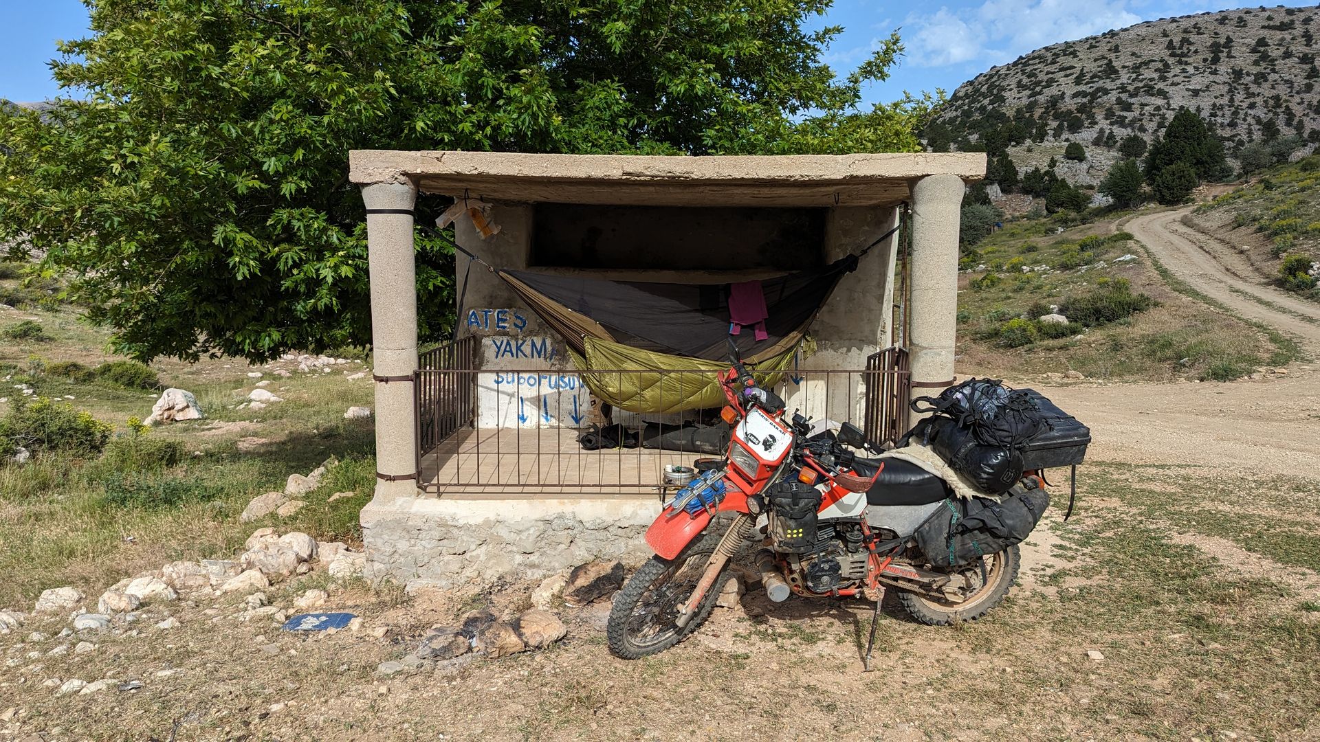 Ich habe etwa jede zweite Nacht darin geschlafen und die anderen Nächte auf dem Boden. Diesen Wechsel fand ich sehr angenehm und war dadurch auch sehr flexibel bei der Schlafplatzwahl. Wenn ich auf dem Boden geschlafen habe und die Mücken mich gepiesackt haben, habe ich mich außerdem einfach auf dem Boden in die Hängematte gelegt, den Reißverschluss zugemacht und darin rechts und links von meinem Kopf meine Motorradstiefel aufgestellt, sodass ich vor den Mücken sicher war.