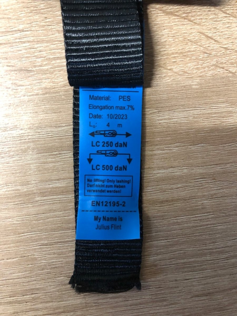 Also habe ich mir jetzt 4m lange Polyester Zurrgurte mit einer angegebenen Tragkraft von 250kg im geraden Zug und 500kg in der Umreifung (habe Online 25mm Zurrgurte bis 800kg in der Umreifung gefunden) besorgt.