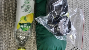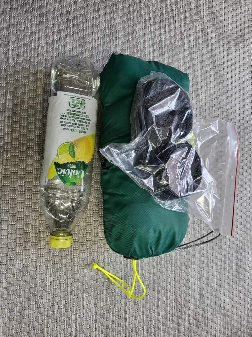 Matte, Baumgurte und Tie Outs im Größenvergleich mit 1,5L Flasche: