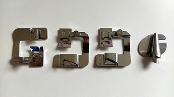 Ich checks nicht und das f***t mich gerade echt ab. Keine Ahnung, wie man mit dem Rollsaumfuß (rechts) richtig arbeiten soll. Es kommt auch darauf an, wie man den Stoff vorrollt. Führt man ihn nur einmal umgeschlagen ein, wird er auch nur so genäht. Von alleine dreht der Stoff sich nicht in die Schnecke und schlägt sich dann nochmal um. Oder ich kann es nicht. Nerv. Für sowas bin ich auch zu ungeduldig. Die anderen passen leider nicht auf meinen Fuß.