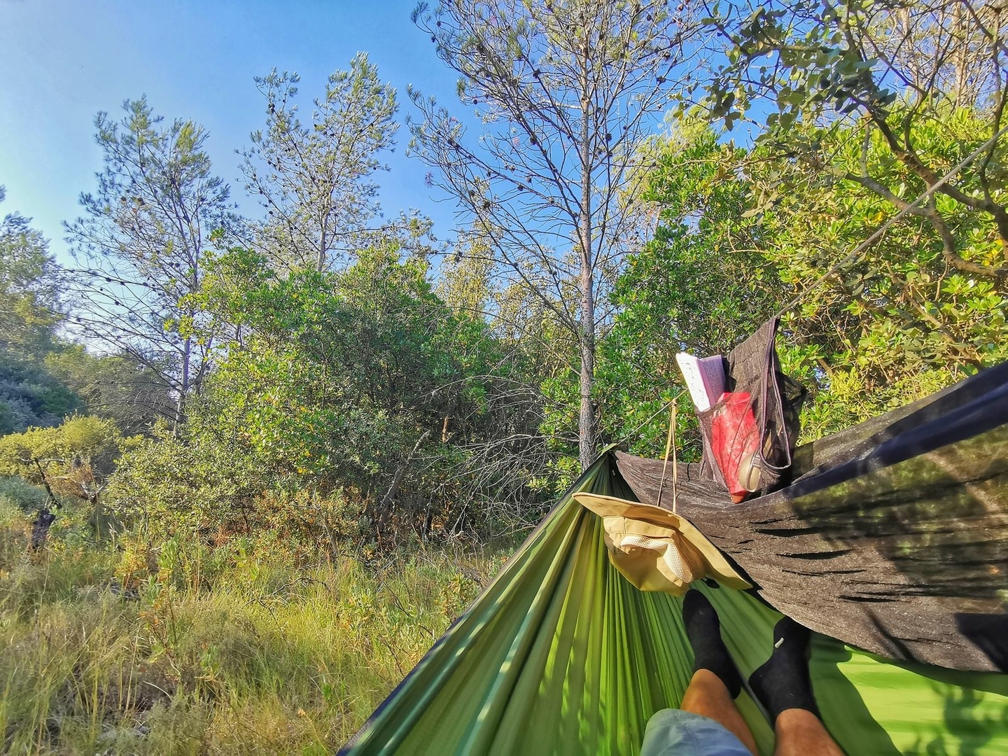 Weil der Mistral so stark blies, musste ich nachts die Hängematte verlassen und mir einen Windschutz basteln.