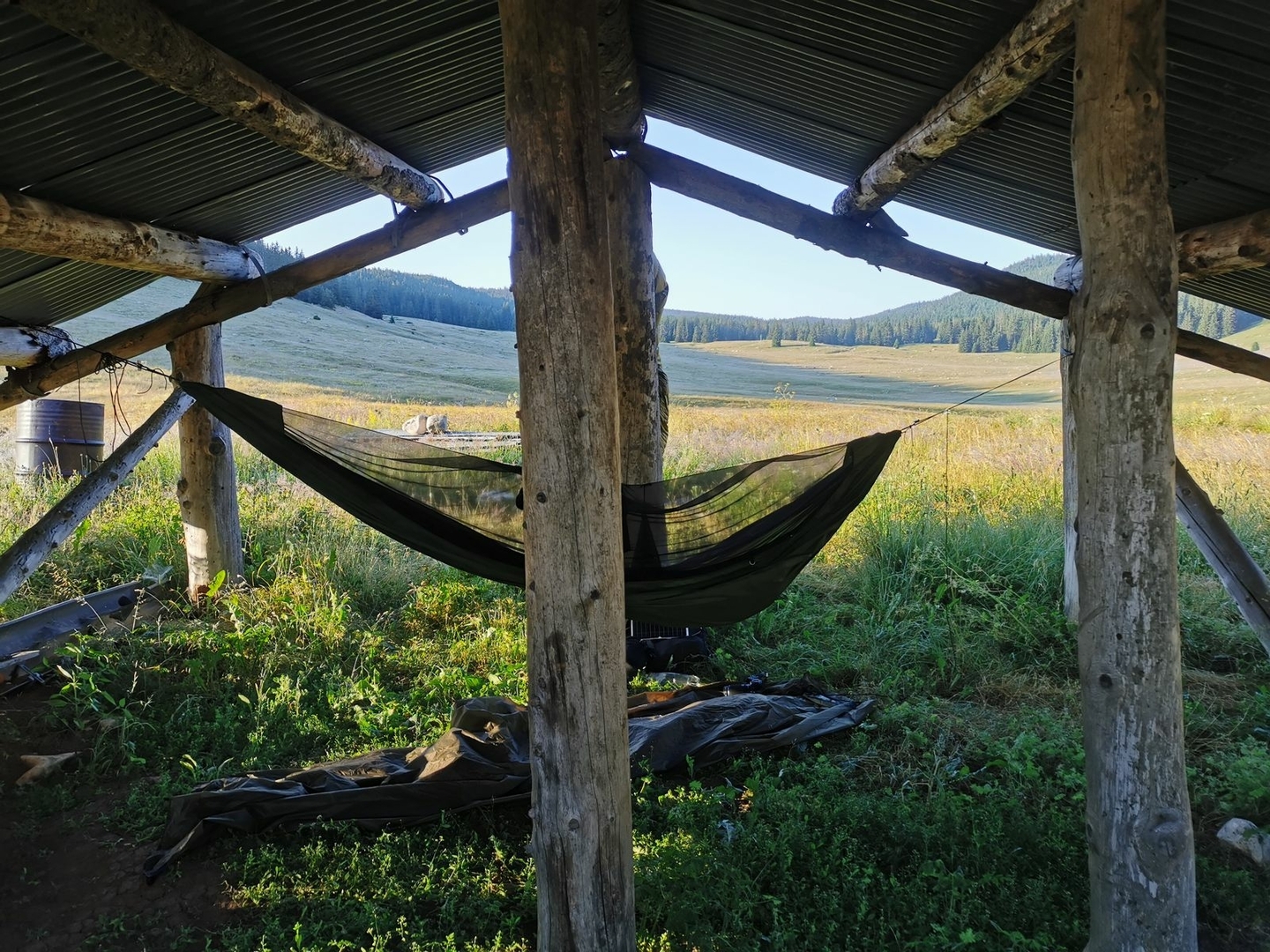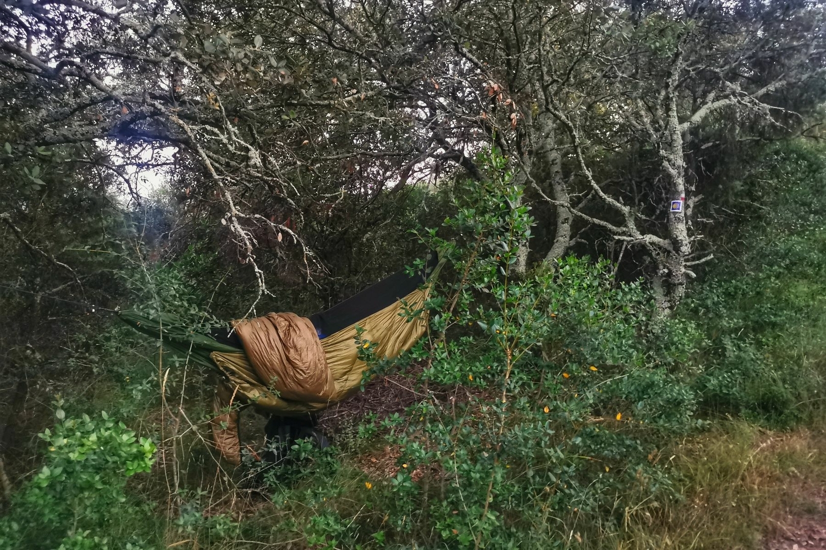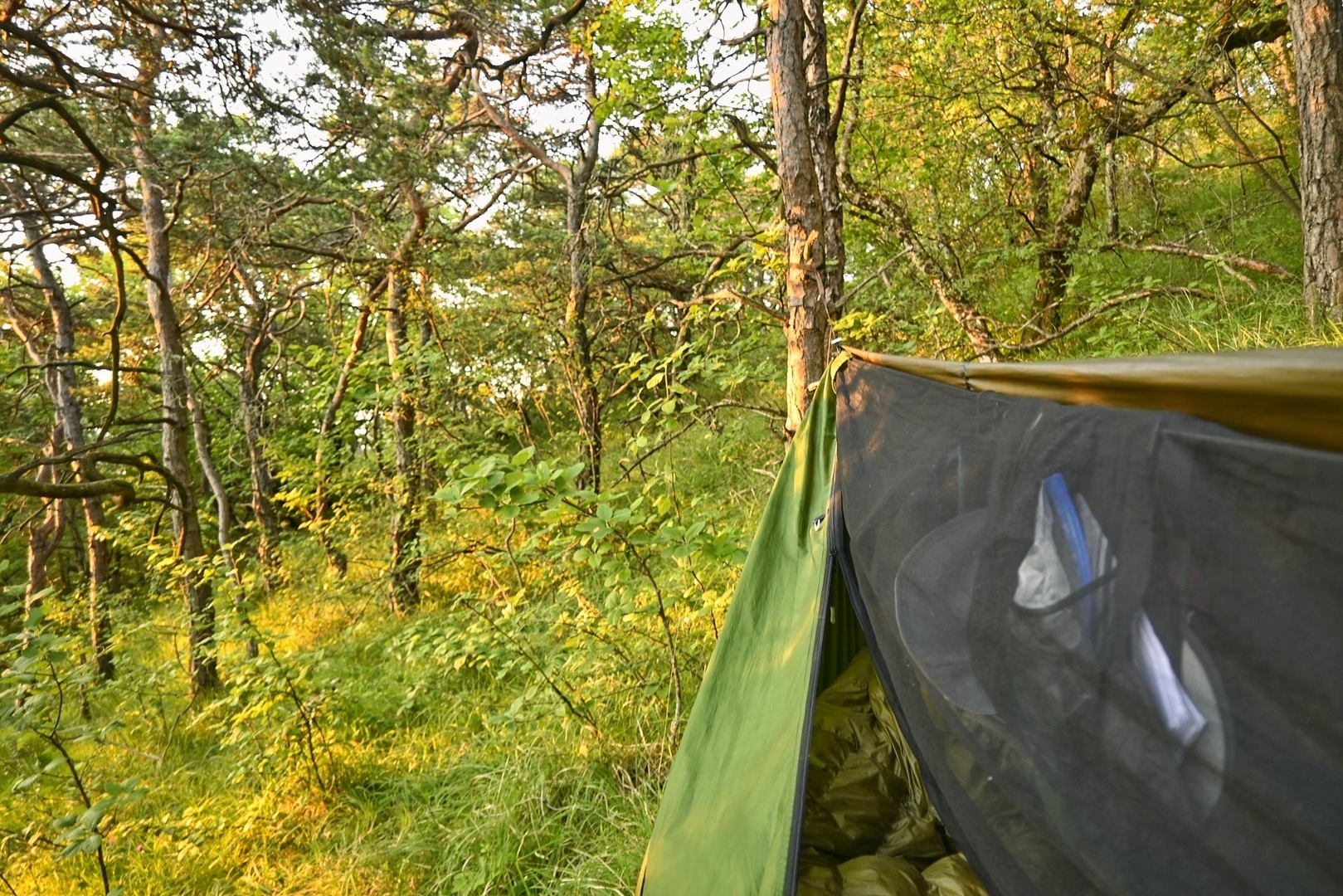 Die Sache hatte allerdings einen Haken: Er stand in einer Senke und kaum war die Sonne weg, bildete sich ein Kaltluftsee und zwar so richtig. Am Morgen hatte es Bodenfrost und Reif. Ich hatte mir das Tarp unter den Underquilt gehängt und alles Isolierende in die Hängematte reingelegt, so liess es sich aushalten.