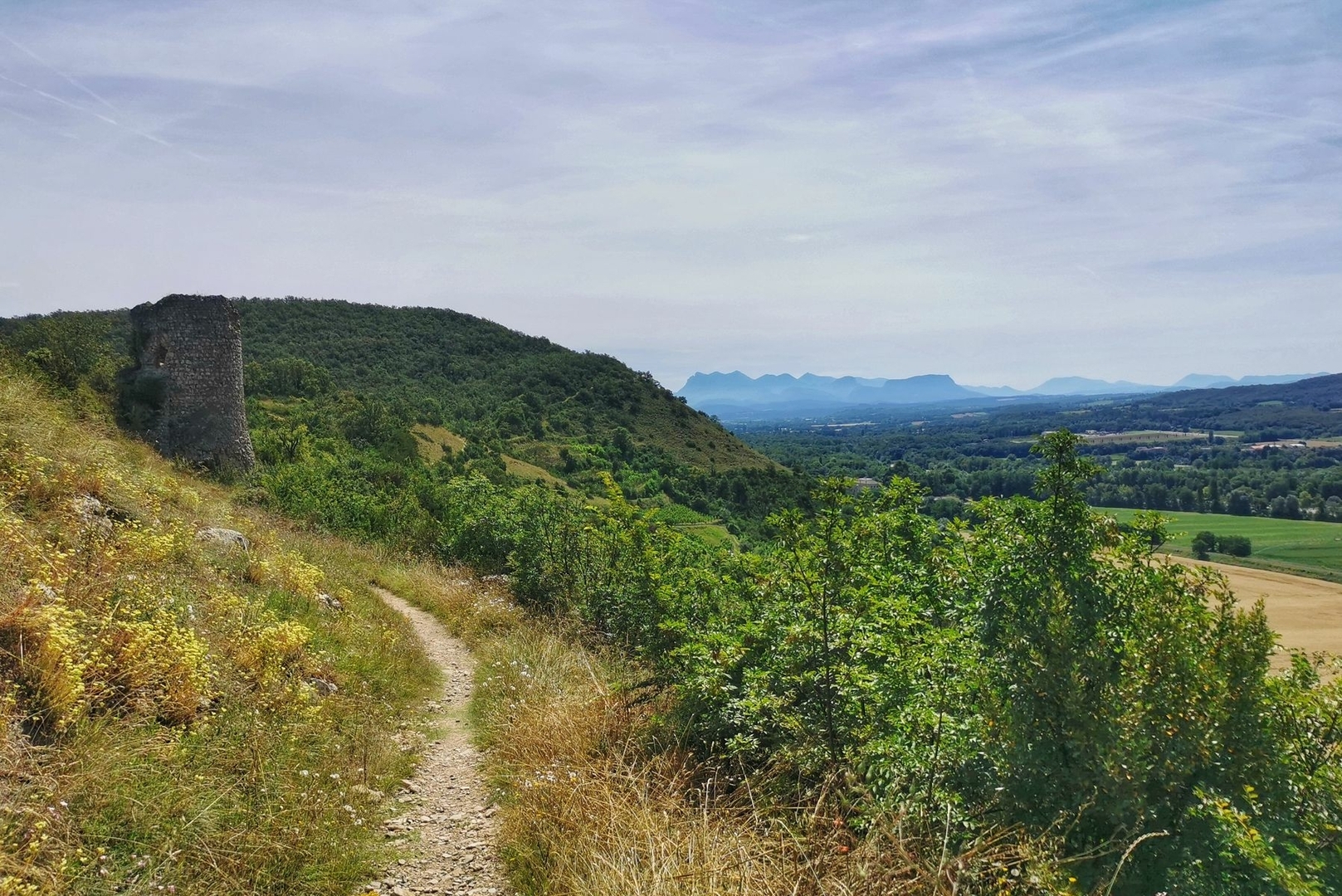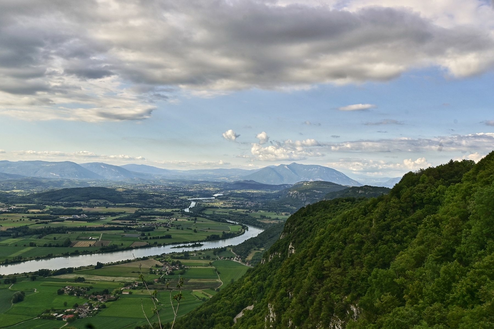 Ich folgte nun einer Jurakette gen Norden. An dem Tag war es so schwül, dass ich den ganzen Weg in meinem eigenen Saft garte und einfach nicht trocknen konnte. So lief ich mir einen Wolf. Gegen Abend wurde es freundlicher: Aussicht auf die Rhone.