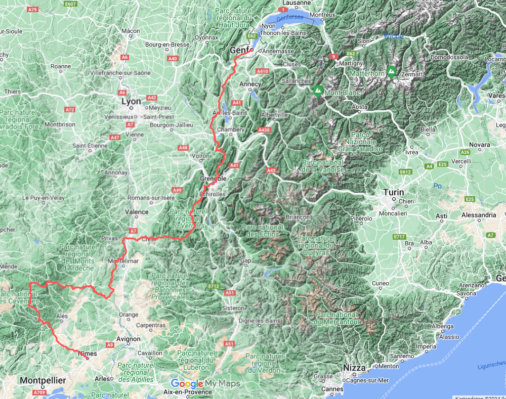 Aber was für eine Tour! auf der Karte wird erst ersichtlich, welche Distanz das war. Wunderschöne Gegend, aber am meisten beneide ich Dich um Dein fließendes Französisch. Würde ich sofort eintauschen gegen alle Touren, die ich bisher gemacht habe. Und dann die nächsten Jahre nur nach Frankreich :love: