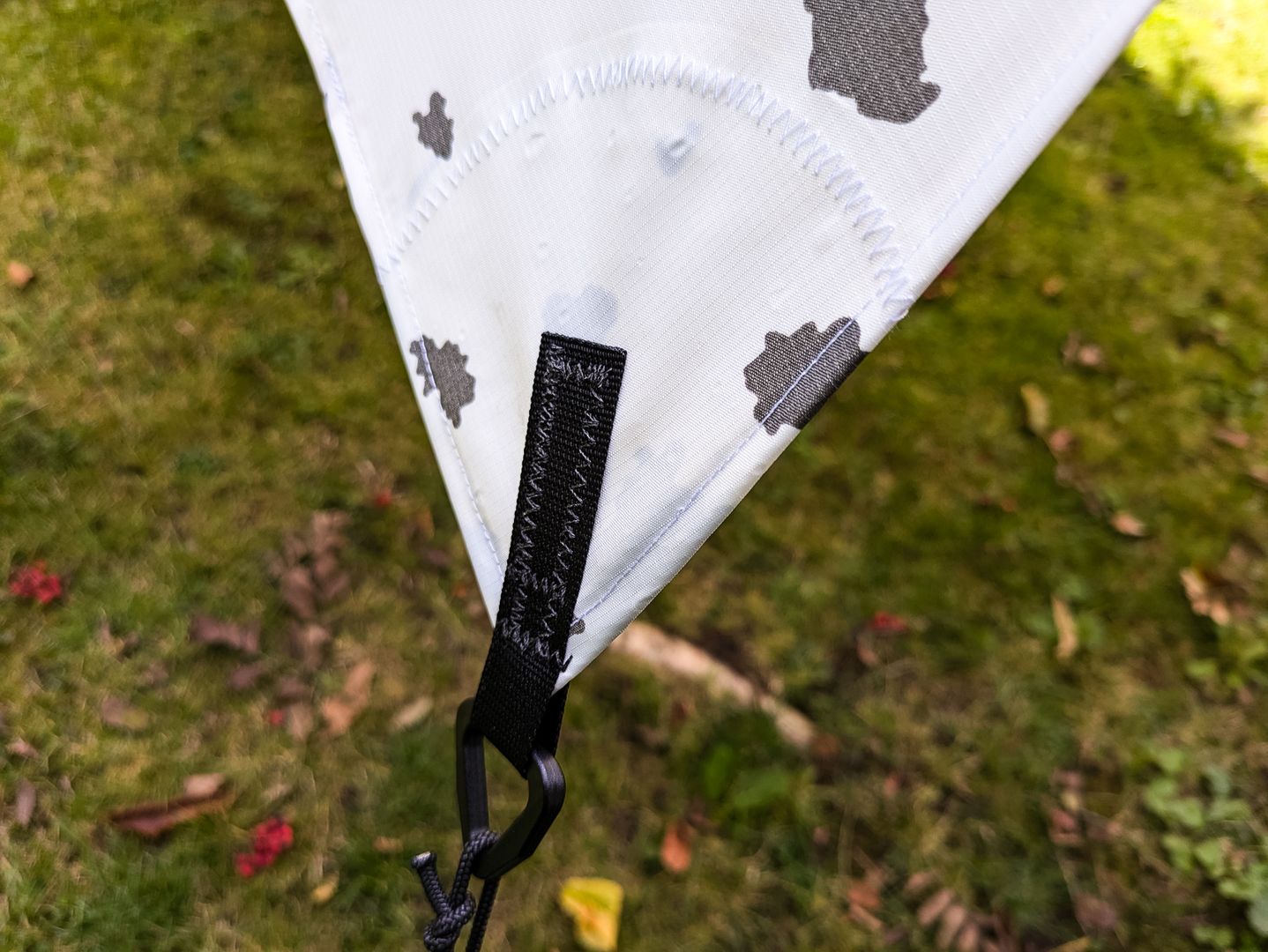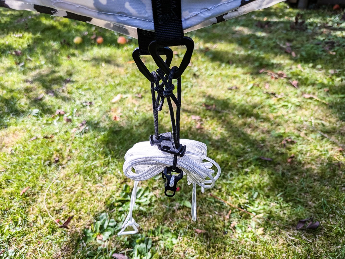 Für die Firstleine habe ich ein Gurtband aus Dyneema genommen. So kann ich ordentlich Zug auf die Seiten bringen, da ich mich für eine geteilte Ridgeline entschieden habe. Die Abspannleinen sind aus Polyester mit einem Dyneema-Kern.