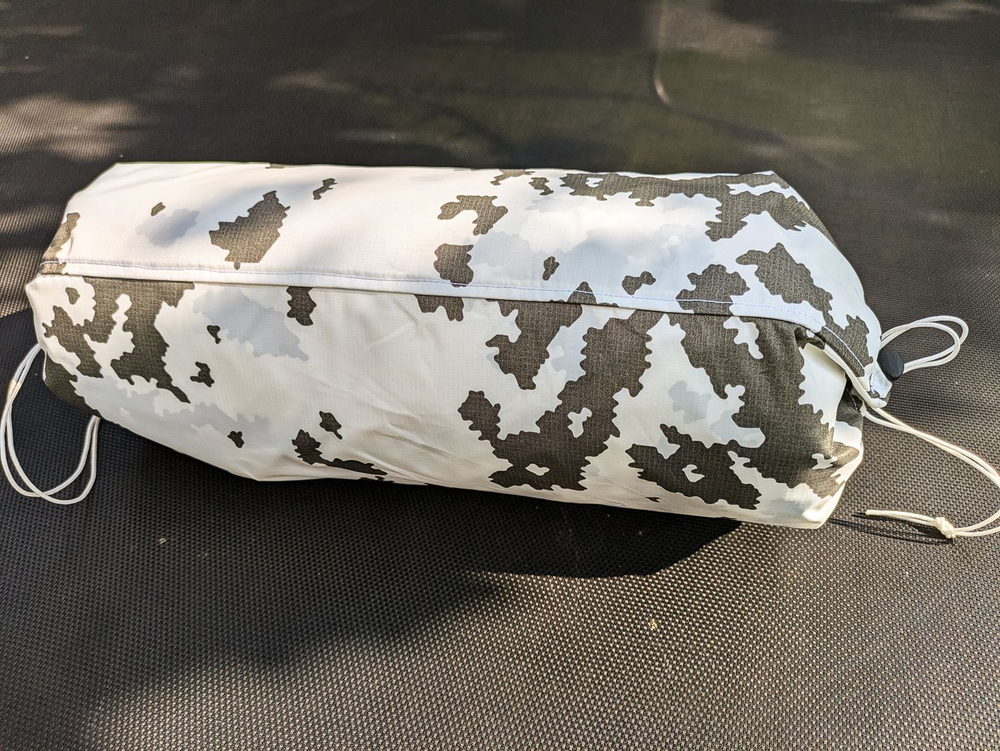 Der Stoff wird eigentlich für die finnischen Streitkräfte hergestellt und ist ein Nylon-Ripstop Gewebe mit PU coating und einer Wassersäule von > 10.000m. Er wiegt 100g/m2 und ist 145cm breit.