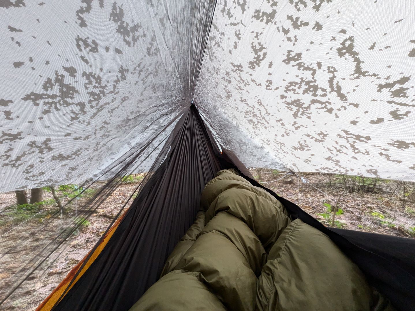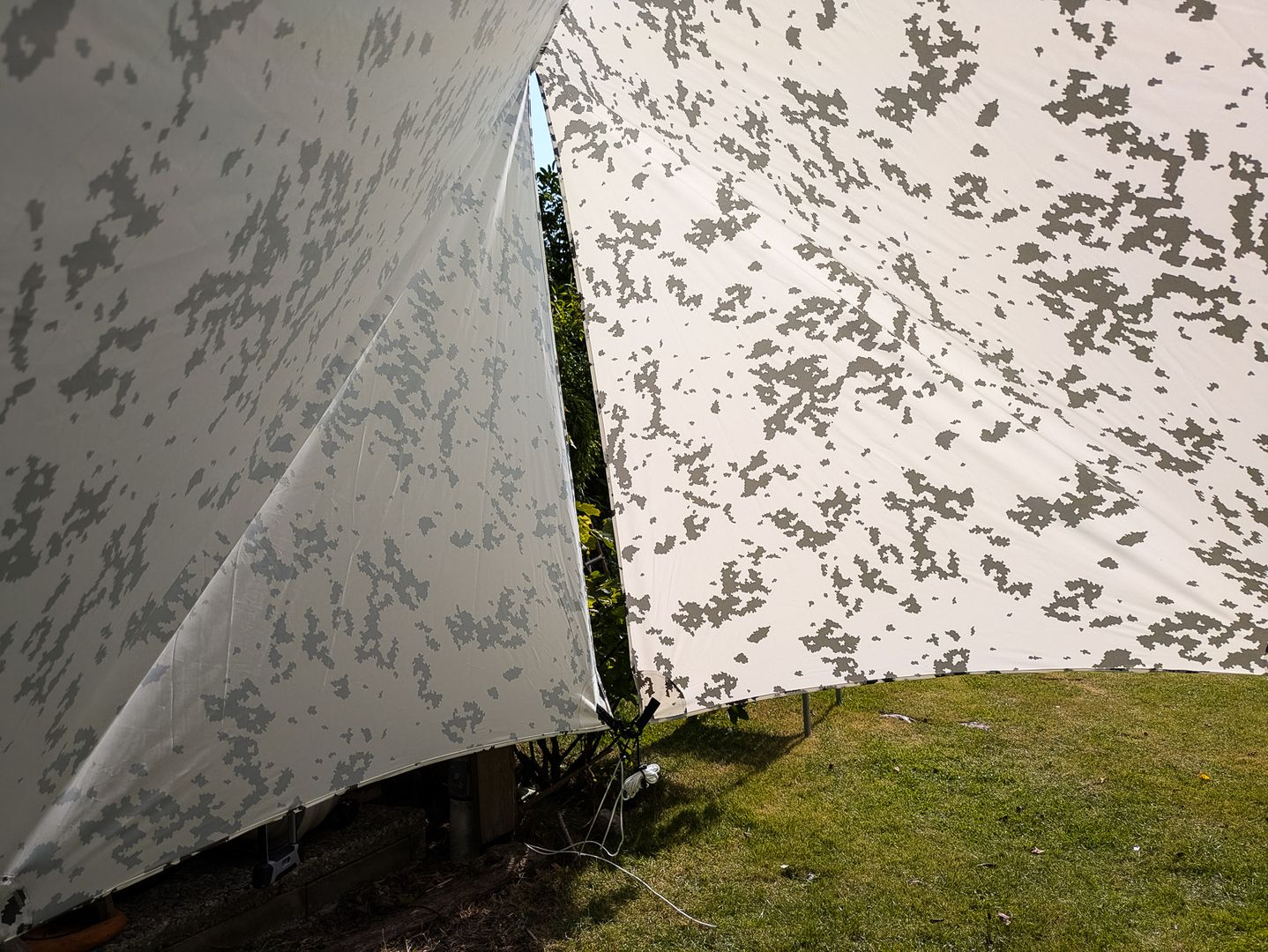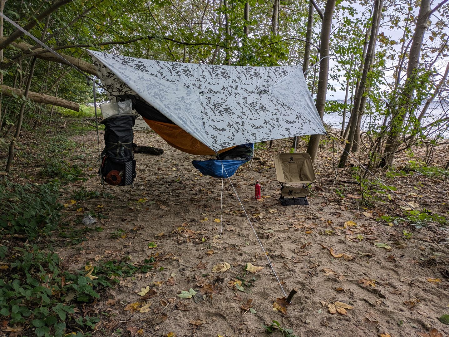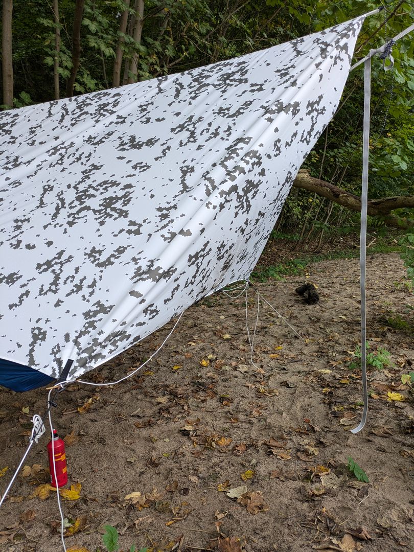 Wie mache ich die Firstleine? Diese sollte keine gerade und schwarze Linie wie bei den Warbonnet Tarps sein. Denn schließlich hat der Stoff eine reduzierte Infrarot-Signatur (IRR compliant). Immerhin hängen wir oft in Eckernförde ab, wo ja auch die Kampfschwimmer trainieren. Eine gerade, schwarze, parallel zum Erdboden verlaufende Linie wäre mir hier viel zu auffällig gewesen.