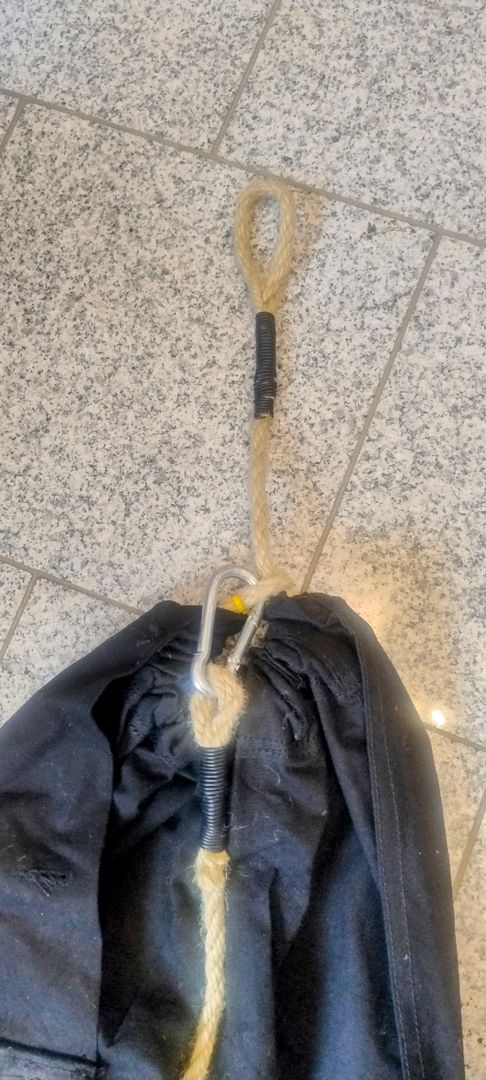 Heute konnte ich mich dann um die Aufhängung/Ridgeline kümmern. Nach etwas überlegen habe ich mich gegen Dyneema/UHMWPE und stattdessen passend zum Stoff Kunsthanf-Seil verwendet. Nur wie macht man aus Kunsthanf einen Continuous Loop?