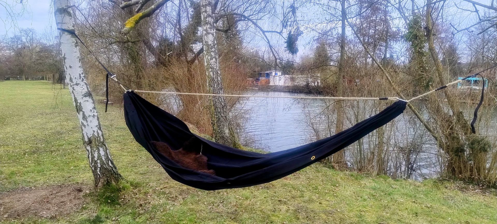 Danach gings raus an die Lahn, da kenne ich ne schöne Stelle zum hängen. Provisorisch erstmal eine RL von TTTM drangehängt und mit einem Schafsfell im Rücken testgelegen. Ist schon sehr anders als meine TTTM Lightest Pro, die ja einen sehr weichen Stoff hat und ein Eckchen kürzer ist. Hier dann meine persönliche RL-Länge ausgetestet welche wirklich Spot-On auf den 83% liegt und in der HM die Ridgeline gespleißt nach gleicher Taktik wie die Aufhängung. Baumgurte sind die T-Straps von Amazonas, die lagen hier nunmal noch rum und sind bis auf die Länge wirklich nicht schlecht.