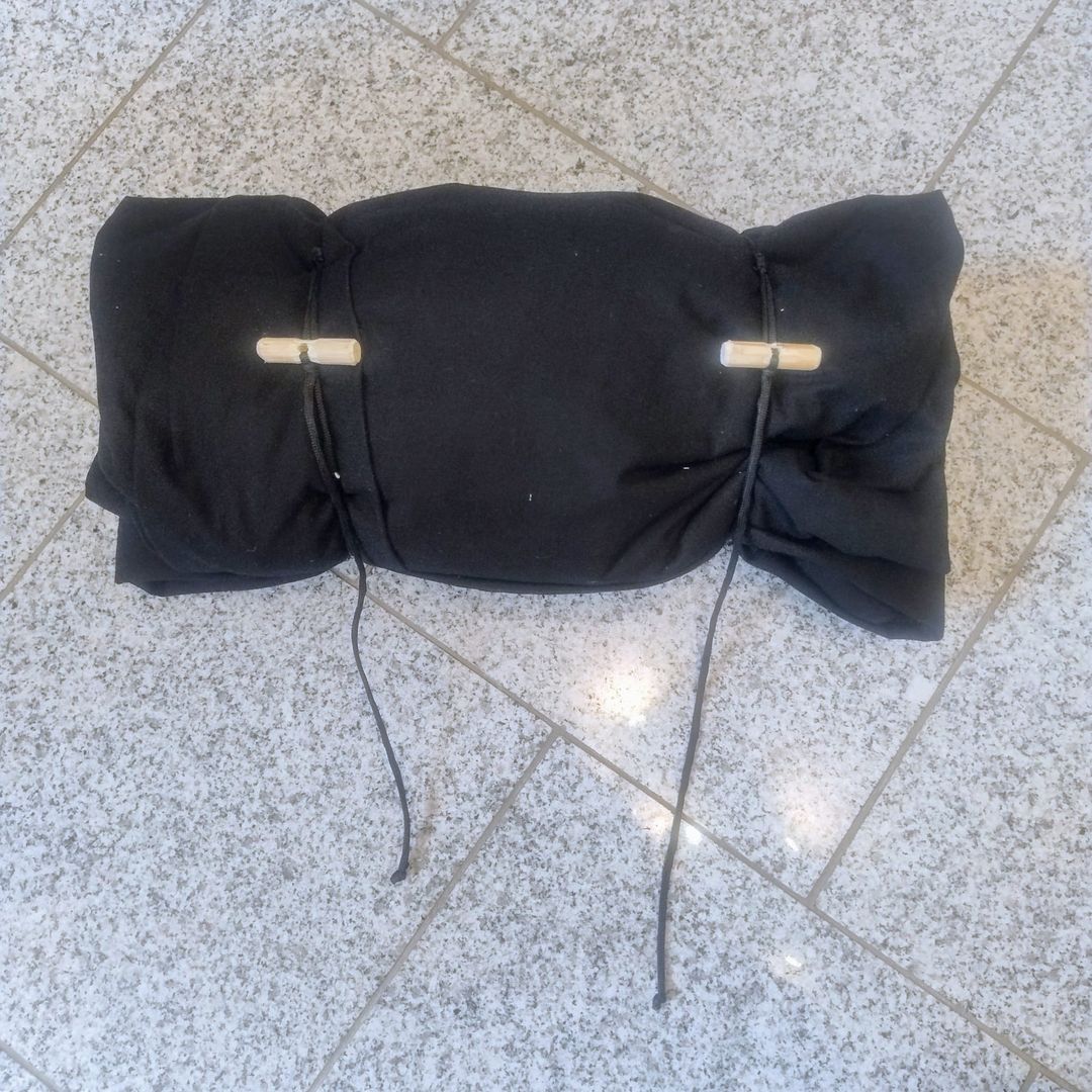 Also das lange Seil durch den Tunnelzug gezogen und ans Ende eine Schlaufe gespleißt. Spleißen hab ich vor langer Zeit auf Zeltlager gelernt, aber das Können ist etwas eingerostet. Das Ergebnis ist eher funktionaler Natur, statt Schönheit. Also den unfreiwilligen Pfusch mit einer Wicklung aus Lederschnur versteckt verschönert. Dann den gesamten Tunnelzug gerafft, was bei dem Stoff echt nen mächtigen Knubbel gibt, und das andere Ende des Seils durch die Schlaufe gezogen. Alles bisschen justieren, ablängen und das Seil gekürzt. Dann am anderen Ende wieder eine Schlaufe gespleißt und mit Lederband aufgehübscht. Andere Seite, gleiches Spiel. Heraus kam das hier, womit ich doch sehr zufrieden bin:
