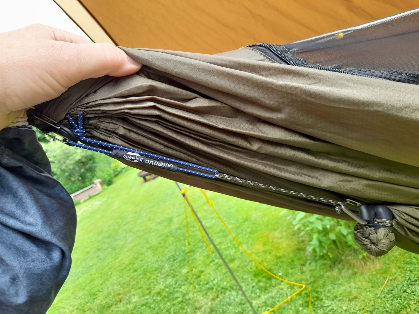 Der Wooki XL bekam daher zusätzliche Schlaufen. Die Hängematte hat seitlich je drei Haken für den Onewind-UQ, die ich hier fremdnutze. ![]()