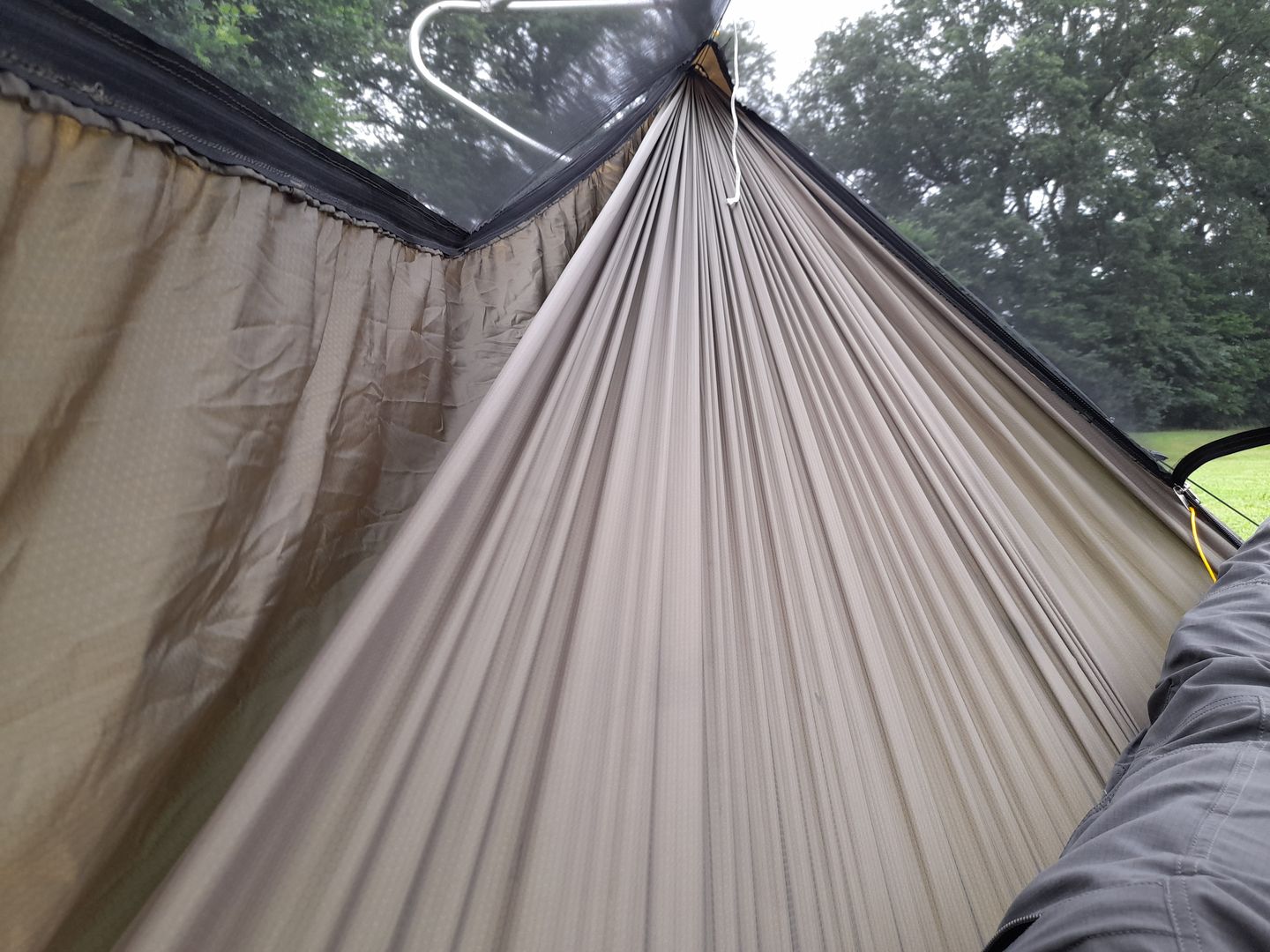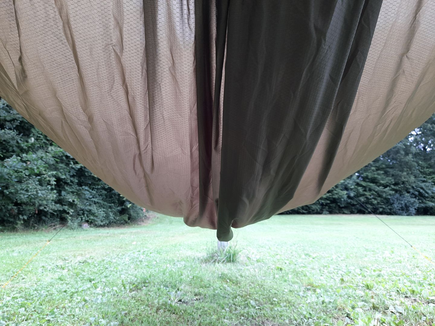 Liegt man in der Matte, bilden sich seitliche Durchhänge des breiten Stoffes. Foto von innen. Hier links besonders gut zu sehen.