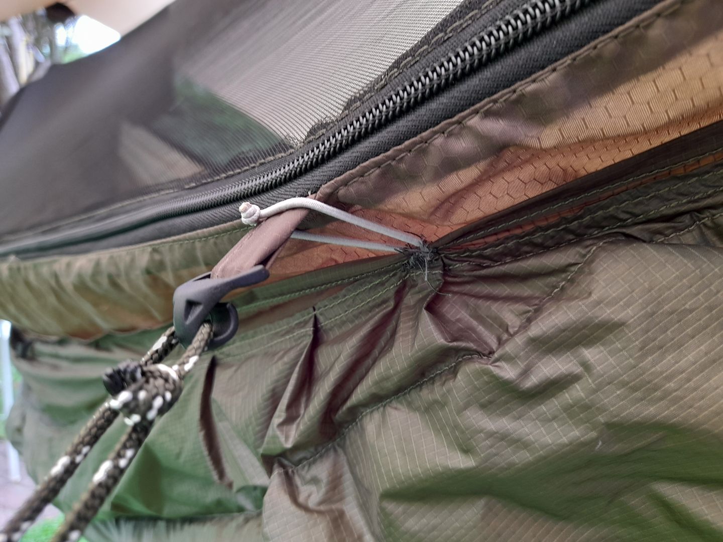 Der Reissverschluss hat zwei Schlitten, die gut und flüssig laufen. Ginge es nach mir, gäbe es vier Schlitten. Dann könnte man das Netz auch aus der Hängermatte heraus zu beiden Seiten öffnen, um z.B. nach dem UQ oder einer darunterhängenden Gepäckmatte oä. greifen zu können.