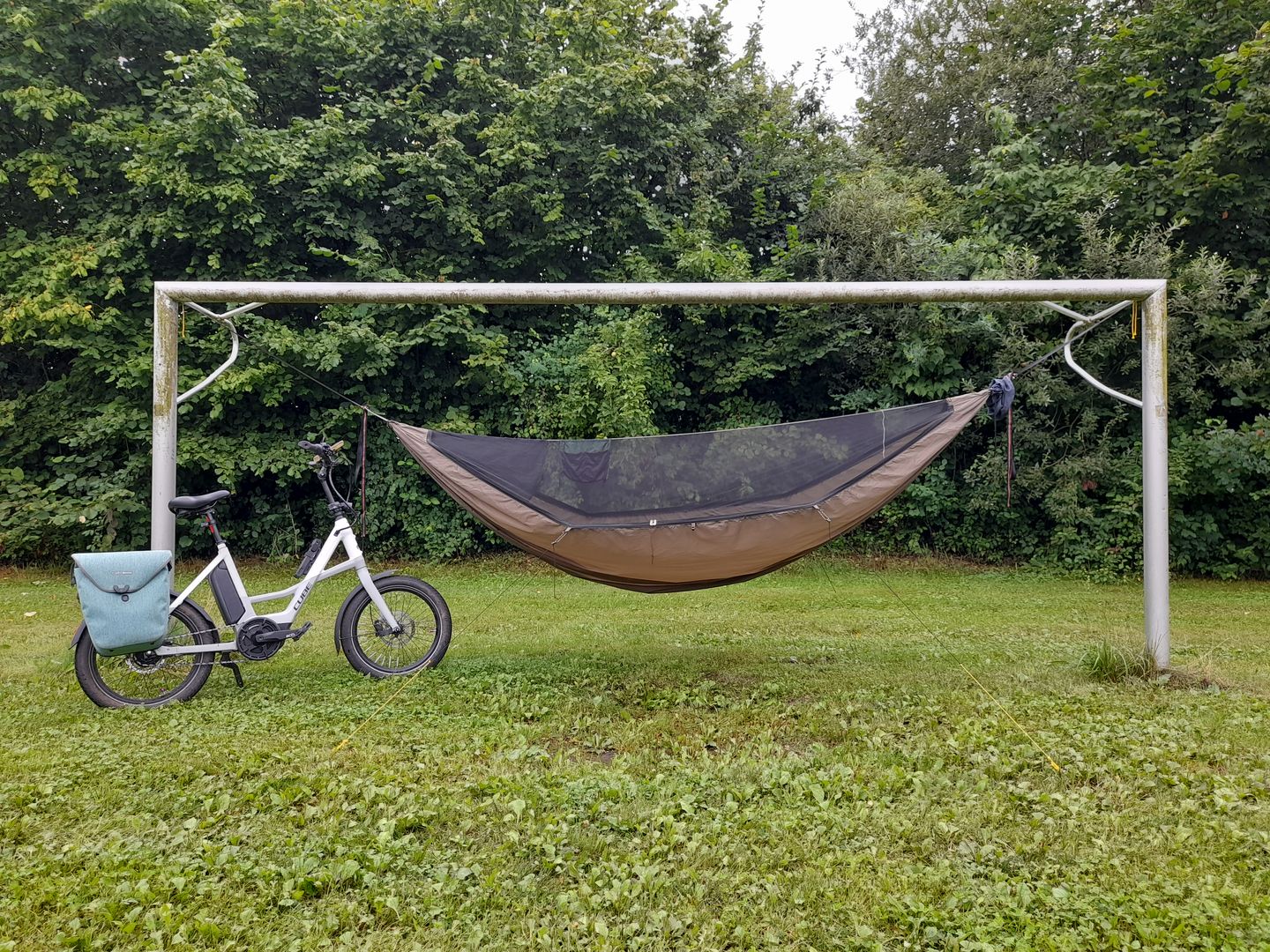 Da der Stoff der Hängematte trotz 70D auch hier wieder relativ stretchy ist, muss man die Matte recht hoch aufhängen, um im Liegen noch ausreichend Abstand zum Boden zu haben. Vorher muss man aber eben die dann hohe Saumkante überwinden...