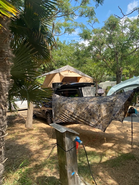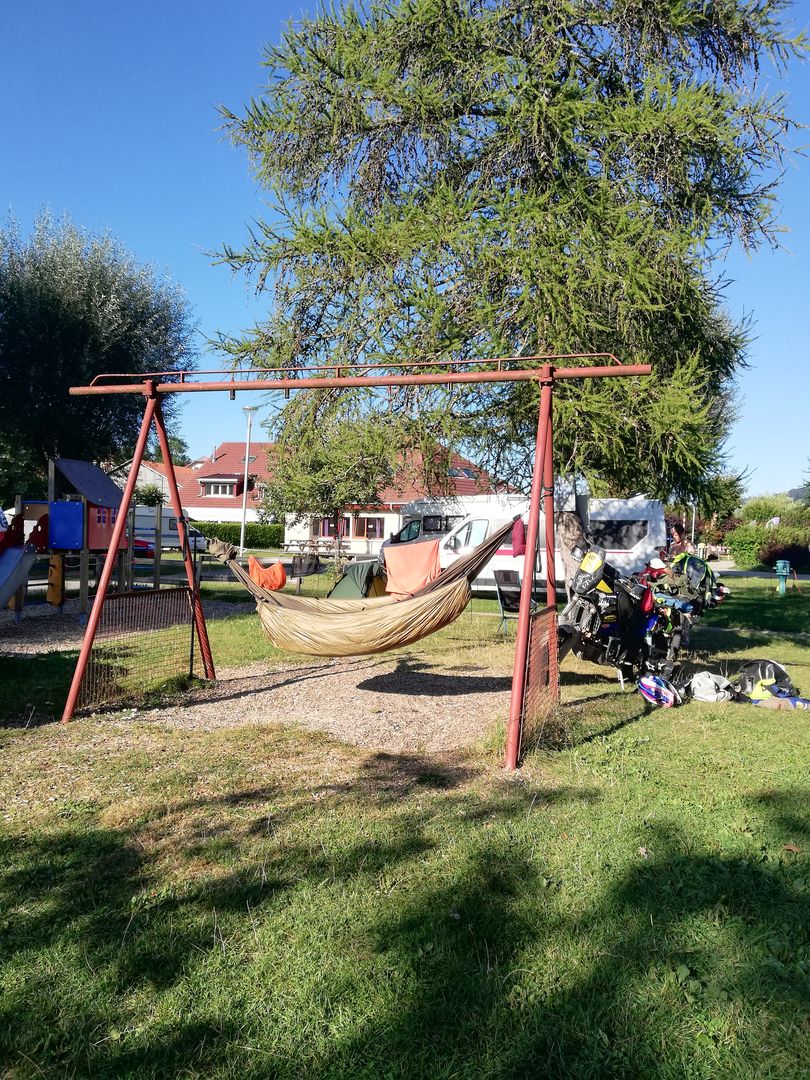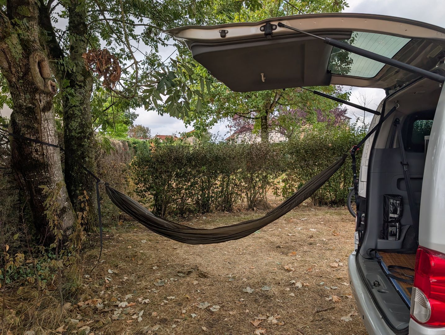 • Ich habe schnell aufgegeben, auf Campingplätzen in der Hängematte zu schlafen. Zu oft fand ich keine geeigneten Bäume, oder die Situation wurde absurd oder indiskret: Kommentare, Spott oder ich musste jemanden bitten, das Zelt zu versetzen, oder ich hing direkt an einem Wohnwagen.