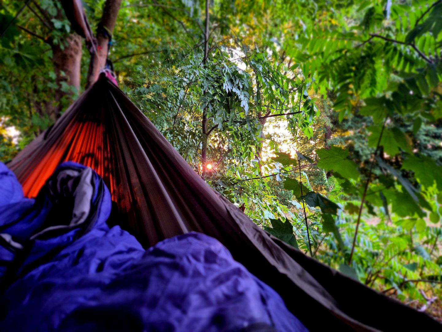 • Gerade hänge ich auf einem kleinen Campingplatz in der Oberpfalz, 1km zur tschechischen Grenze. Bein Einchecken fragte ich nach zwei Bäumen. Ich durfte am Platz selbst suchen. Im eingrenzenden Gebüsch wurde ich fündig. Zu zweit hätte man hier aber ein Problem.
