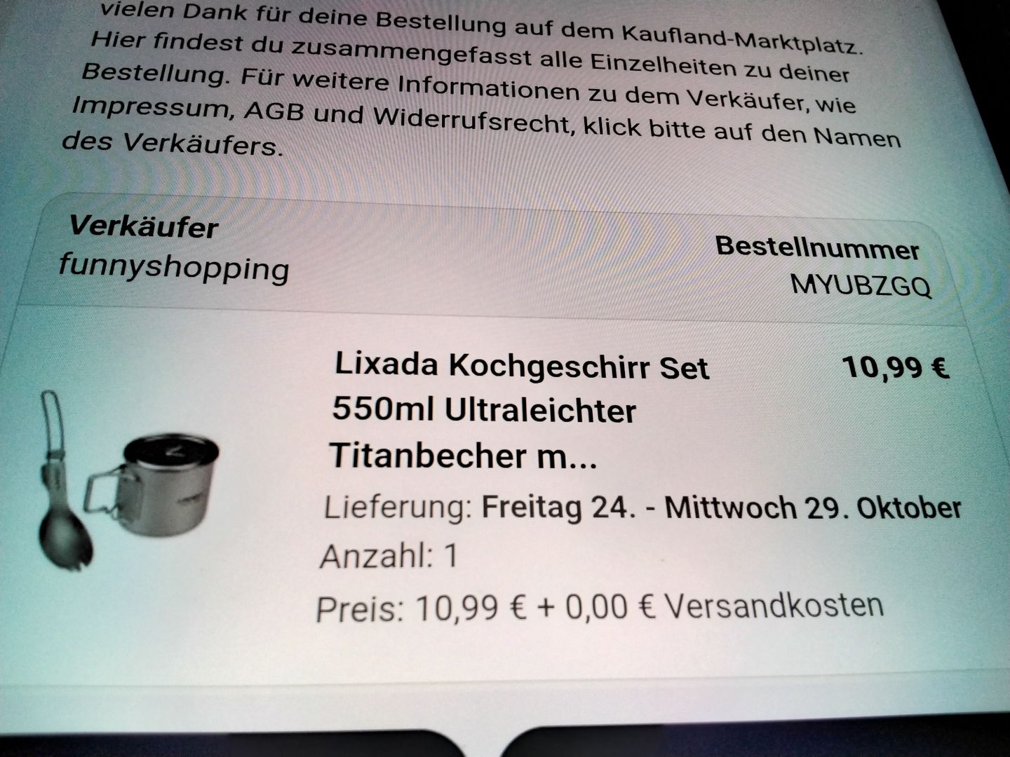 Ein Lixada Topf/Tasse 550ml mit Deckel, klappbarem Titan Göffel und Transportbeutel für unschlagbare 10,99€ inklusive Versand bei Kaufland Marketplace ergattert 👍