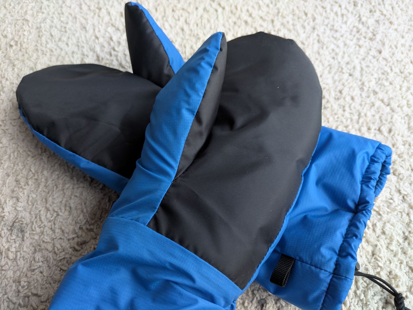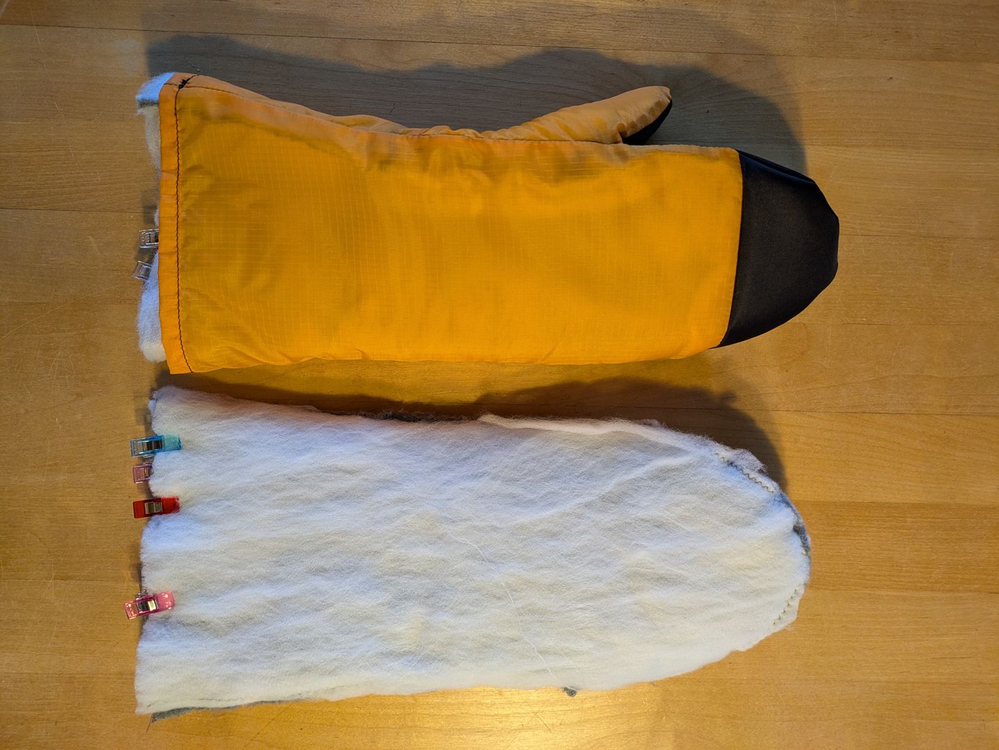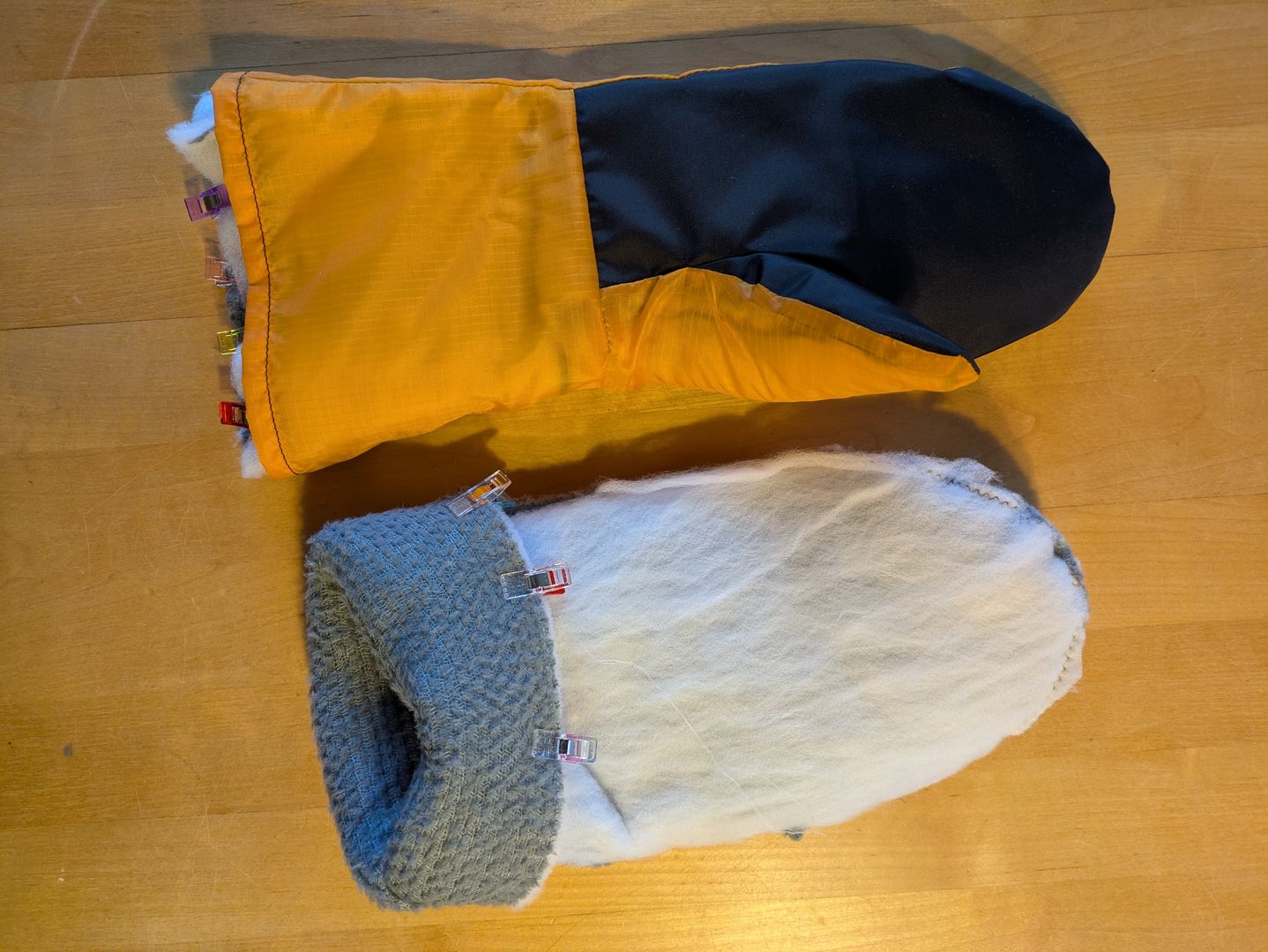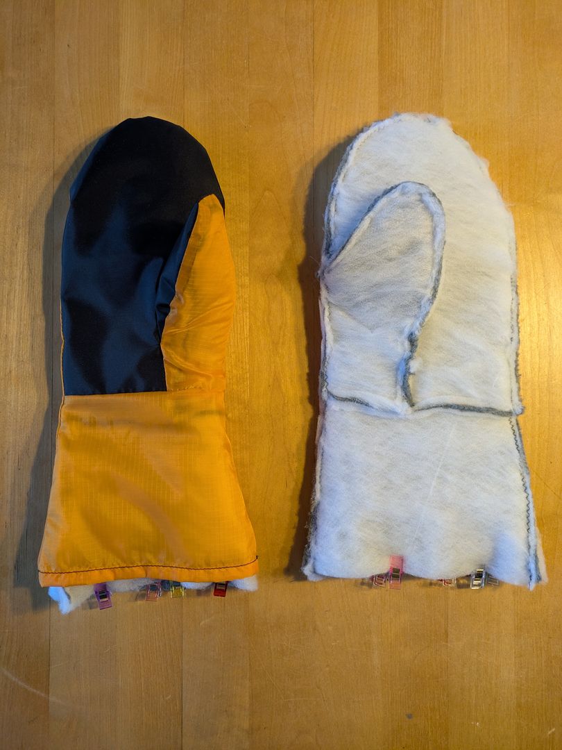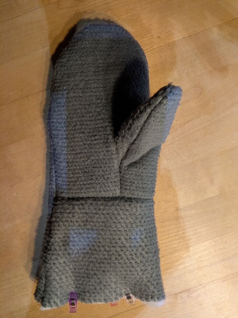 Nachdem ich mir ein Schnittmuster erstellt habe, ging es erst an einen Prototypen für die Außenhülle aus Restmaterial. Die passt soweit, so dass ich im nächsten Schritt nun das richtige Material verwenden werde (Pertex). Die Handschuhe sollen windabweisend und atmungsaktiv sein. Die Griffflächen sind aus einem stabileren Stoff.