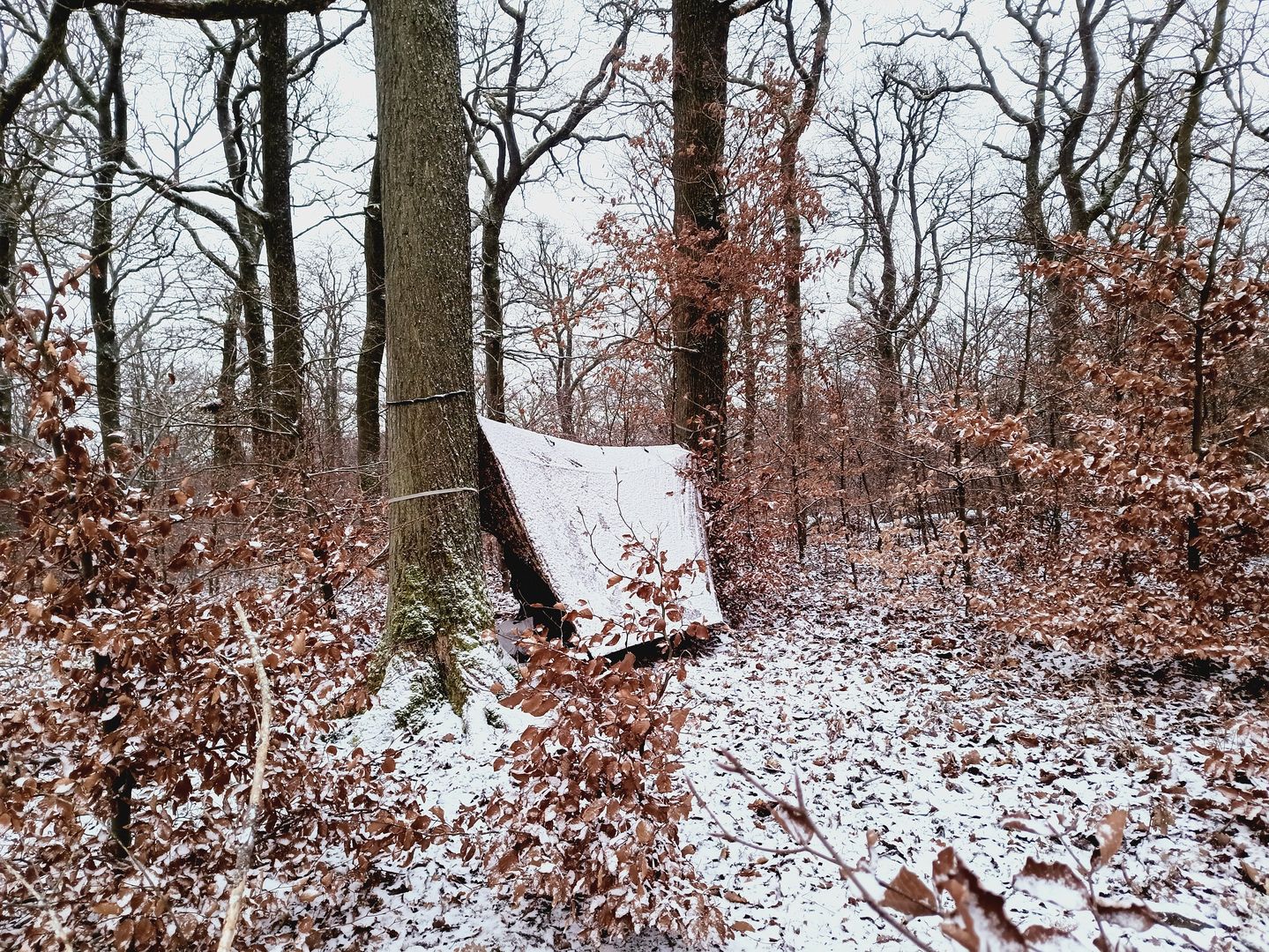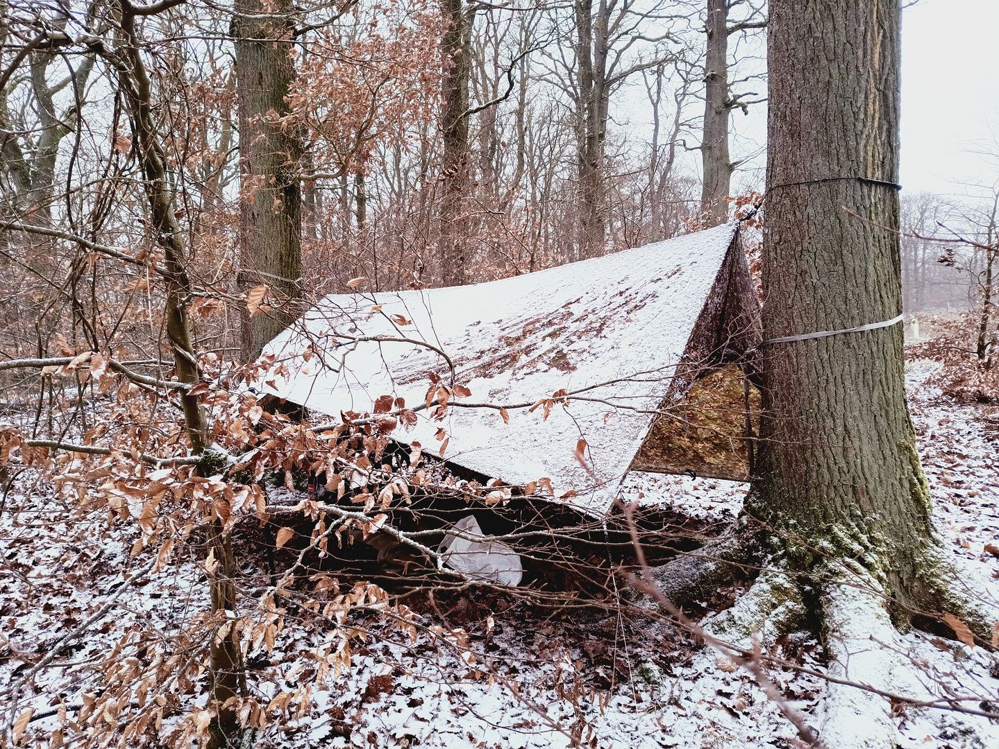Das Timing war perfekt und das Dach war gebaut bevor der erste ernsthafte Schnee runter kam. Nach 15 Minuten war der Spuk auch schon wieder rum und ich bin zum gemütliche Teil übergegangen. Der Schnee war ziemlich feucht und hat an allem regelrecht geklebt. Die Rückseite des Tarp war trotz steiler Abspannung gut mit Schnee bedeckt der nicht abrutschen wollte.