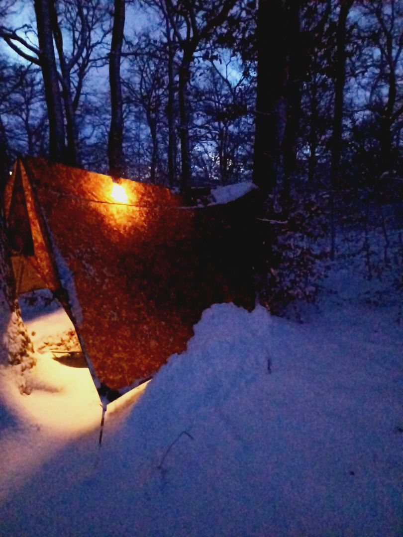 Der große Schneehaufen an der Rückseite ist übrigens erst am Morgen abgerutscht nachdem ich von innen heftig gegen das Tarp gehauen habe. Der Schnee hatte sich trotz der Steilwand zu einer Beule aufgebaut und für erheblichen Druck auf der Ridgeline gesorgt. Was aber dank konstruktiver Ridgeline kein Problem war ;)