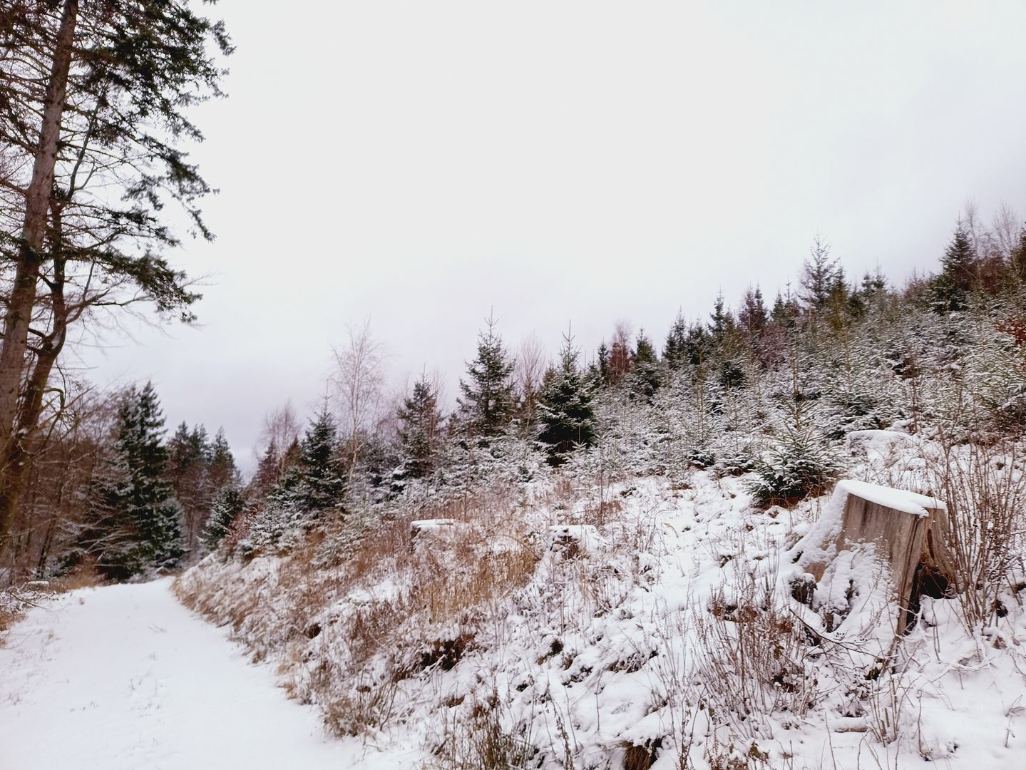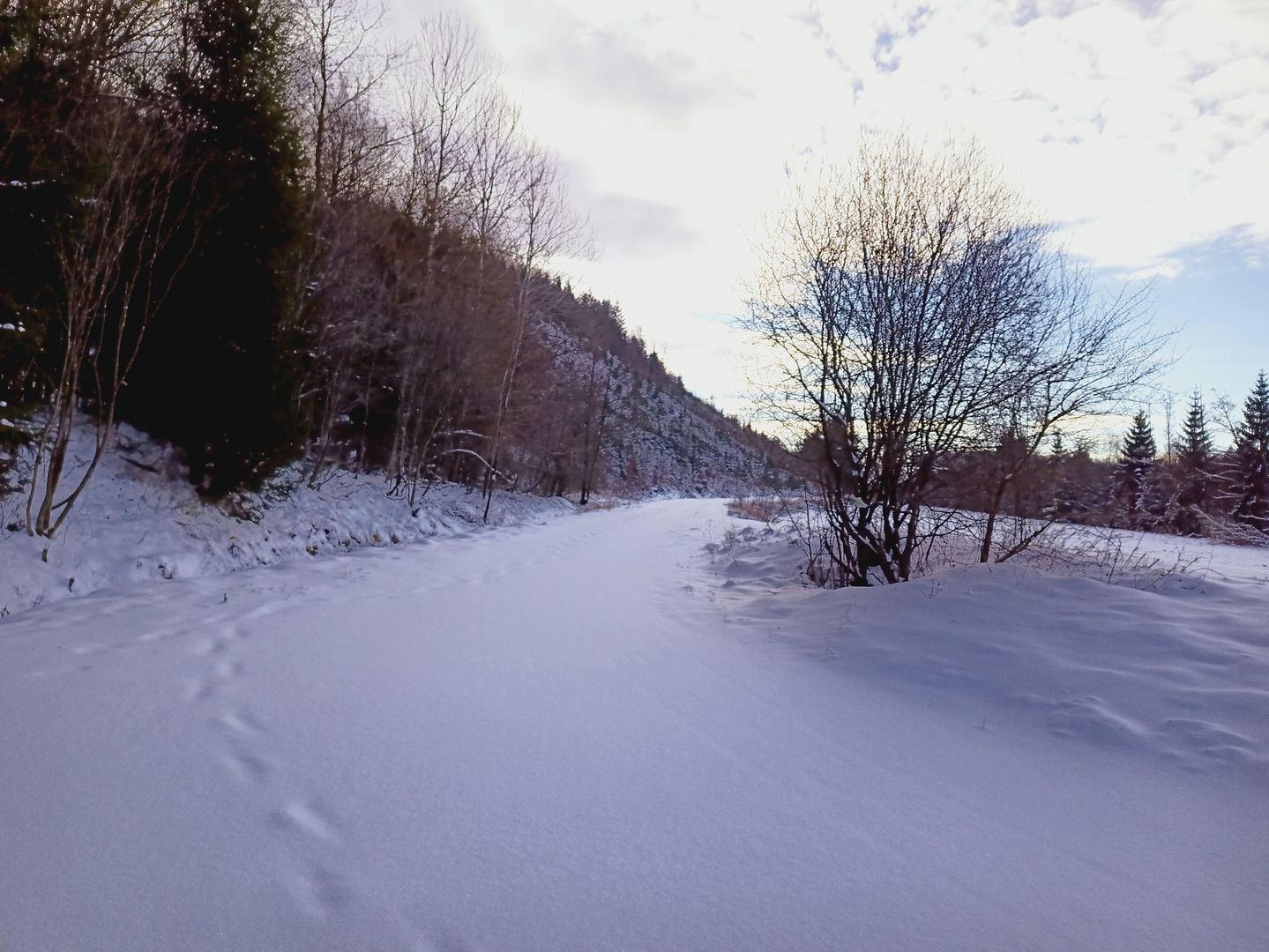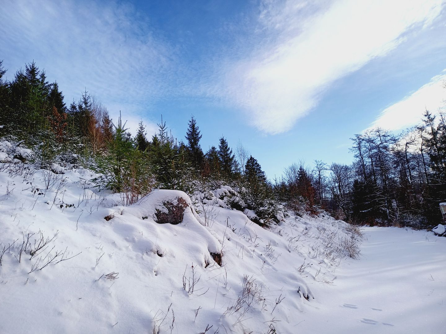 Es lagen je nach Verwehung und zwischen 5cm und 10cm Schnee was das Vorwärts kommen etwas beschwerlicher machte aber da es jetzt erst mal länglich Bergab ging war das kein wirkliches Problem. Die Temperaturen pendelten irgendwo um die 0°C, also nicht dramatisch, nur der Wind war doch recht bissig und führte recht schnell zur Auskühlung. Aber da das ja zu erwarten war, war ich darauf vorbereitet und hab mein Zwiebelsystem so angepasst das ich nicht ins schwitzen gekommen bin aber auch nicht wirklich gefroren habe ...... So ging's gemütlich Schritt um Schritt entlang des Weges ....