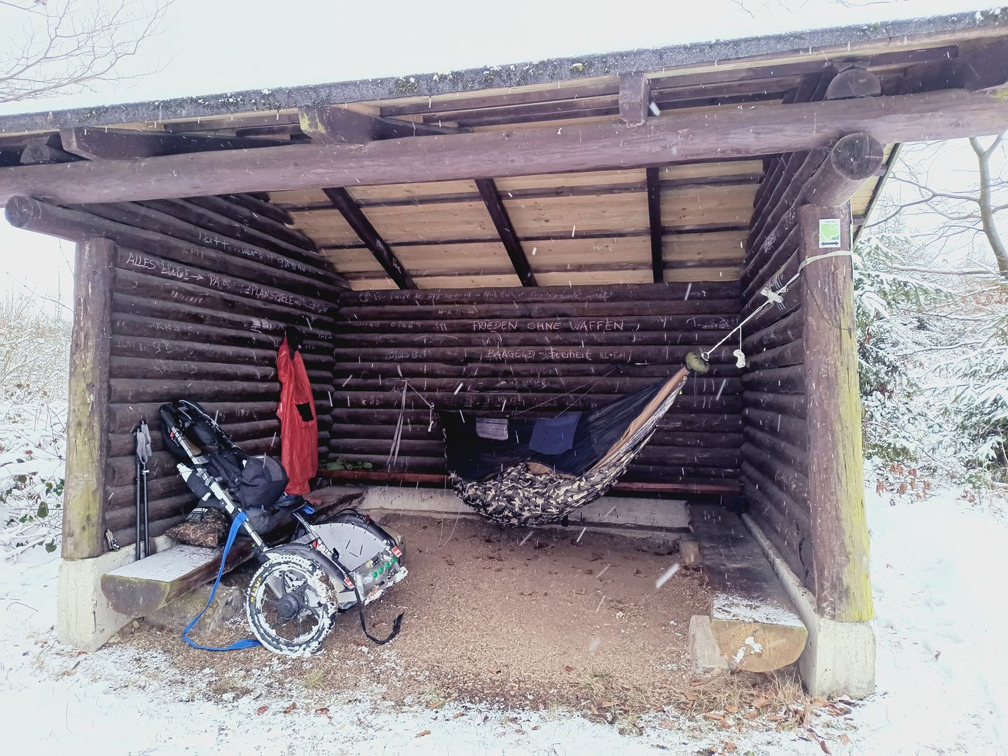 Da am nächsten Morgen an weiter zu gehen immer noch nicht zu denken war blieb ich kurzerhand einen Weitere Tag in der Hütte, materiell fehlte es mir an nichts und vertreiben wollte mich auch keiner. Bei gelegentlich vorbei kommenden Spaziergängern hab ich ein kurze Lebenszeichen von mir gegeben damit sie nicht aus Neugier versuchen hinter die abgespannte Tarp zu schauen....