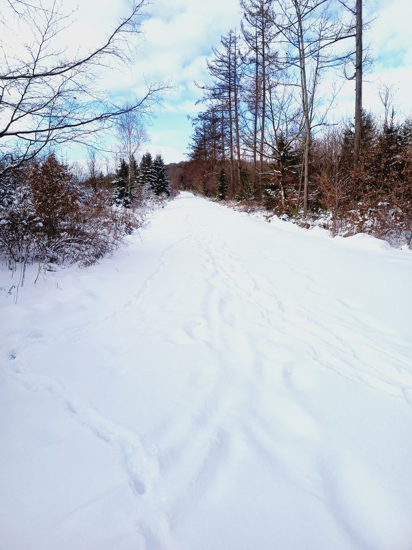Sie machte mir dann auch den leider vernünftigen Vorschlag die Tour zu beenden und heim zu kommen. Sie würde mich auch abholen, ich müsste nur sagen von wo. Aber da lag genau das nächste Problem, ich war mitten im Wald und weit entfernt von legal befahrbaren Straßen , dazu noch eine mittlerweile bis zu 20cm Neuschnee-Schicht mit der unsere Bereifung wohl auch nicht so wirklich klar kommen würde. Also betrachtete ich eine Bergung als möglich "Not-Option" die aber erst mal noch nicht angesagt war. Die Karte brachte dann zu Tage das es bis zum nächsten Bahnhof nur 8,5 Km sind und da für den nächsten Morgen ruhiges Wetter angesagt war wuchs der Plan mich aus eigener Kraft zur Bahn zu bewegen ....