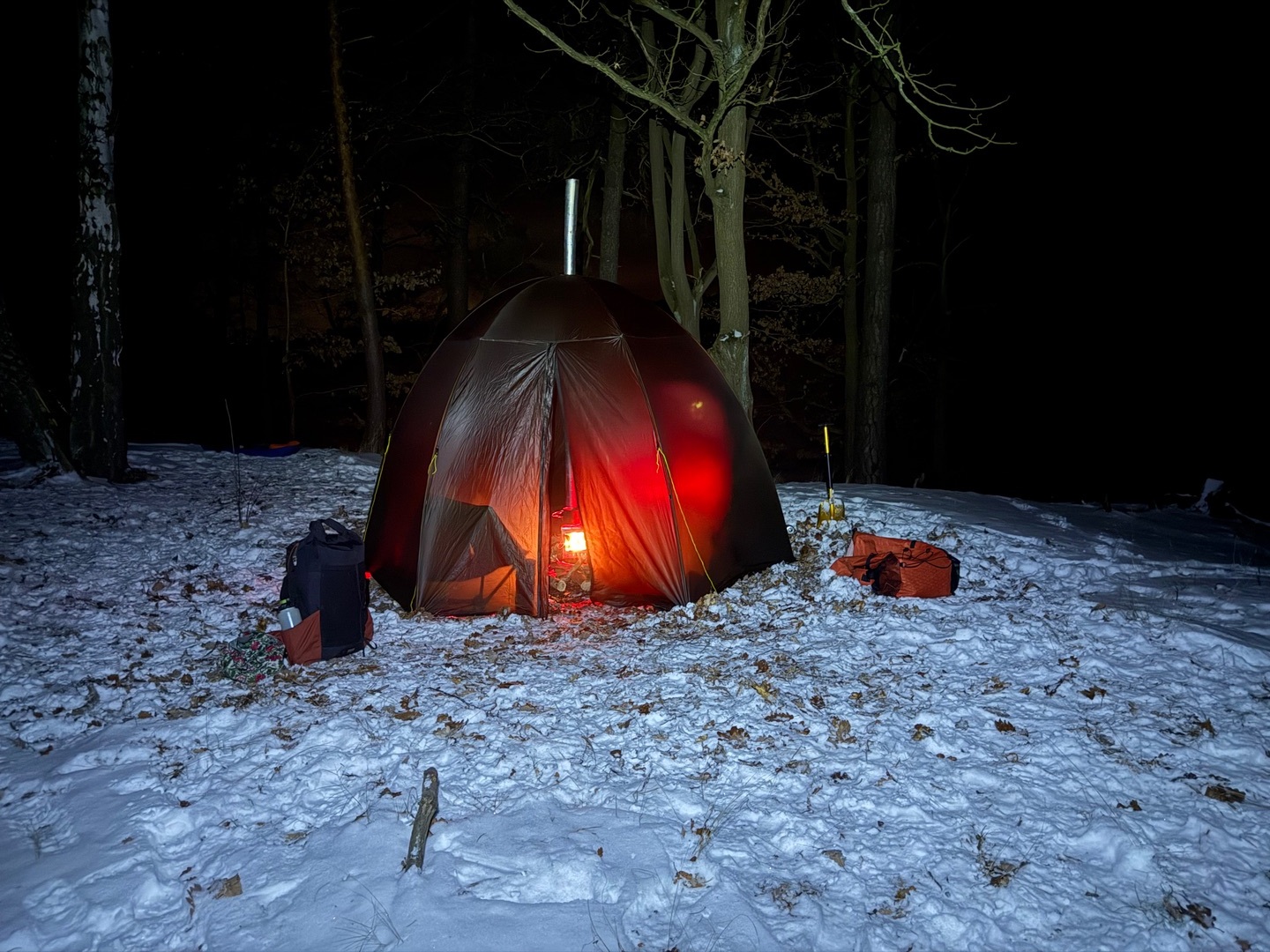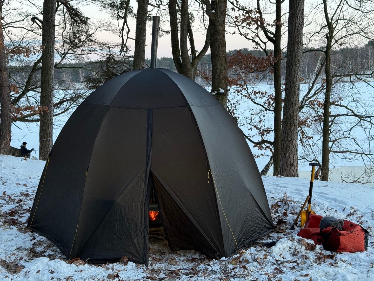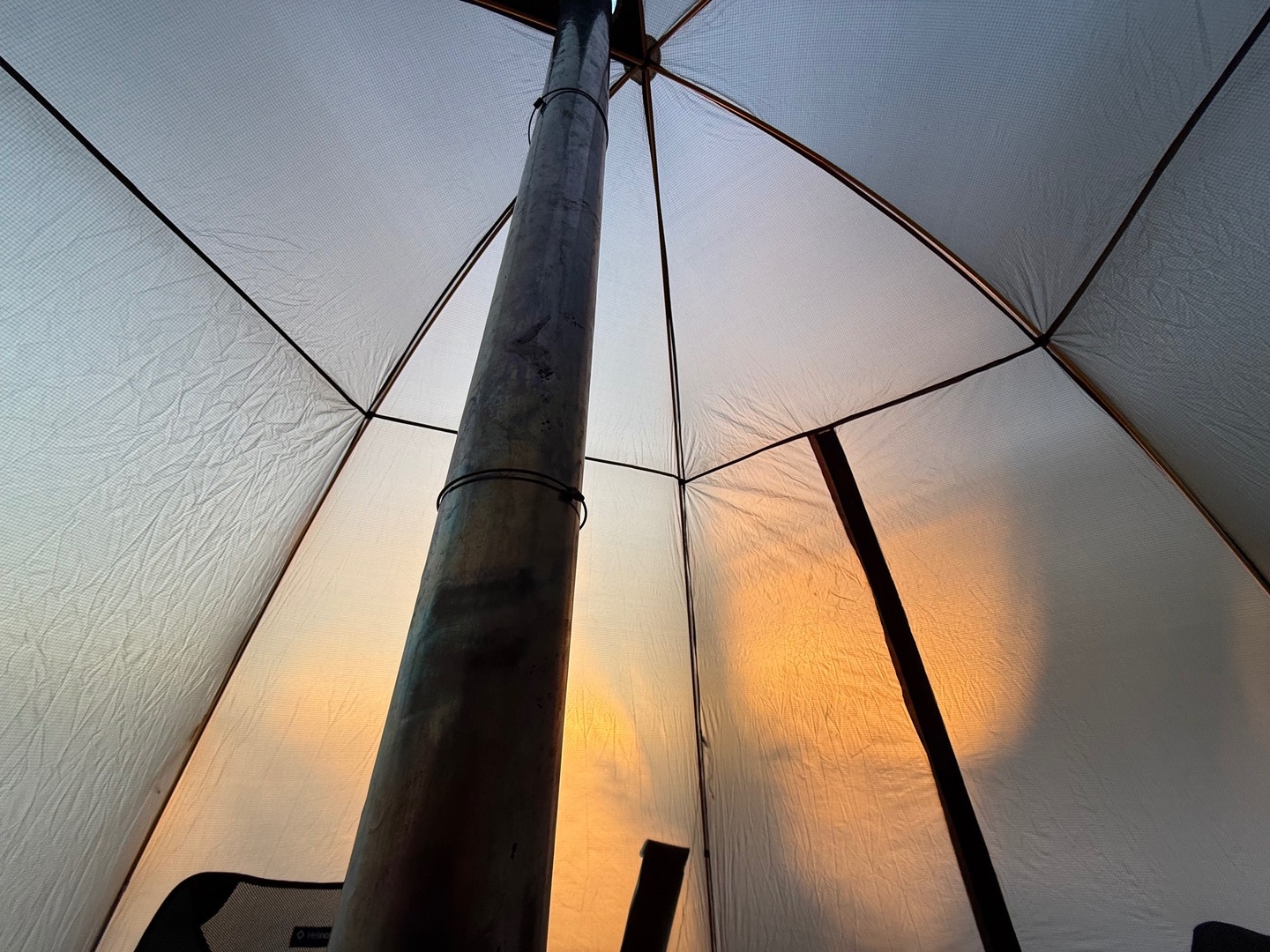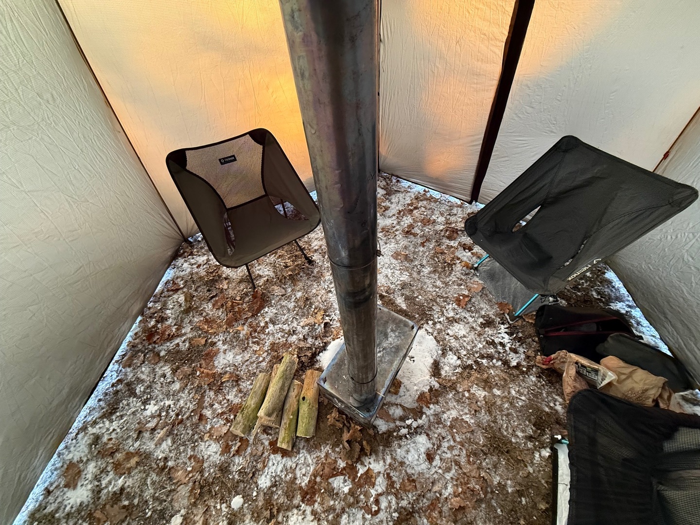 Das Zelt ist frei stehend, Ofenrohr Ausgang ist in der Mitte und es ist noch deutlich "wärmer" ( heißer) bei weniger Holz verbrauch.