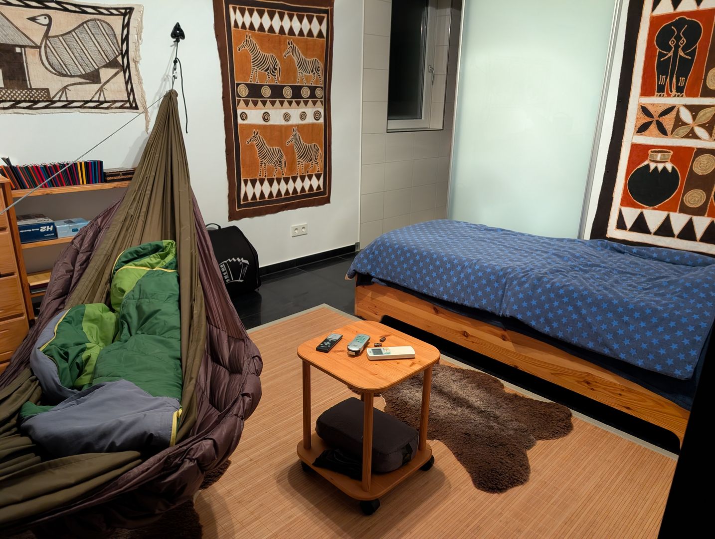 • Ich hab kein separates Schlafzimmer, das ist gleichzeitig Wohnzimmer. Das wollte ich nicht dauerhaft durch eine Hängematte durchschnitten haben :D Da lässt sich nicht mehr viel optimieren, außer dass ich mir noch einen rollbaren Nachtisch bauen will und die Verteilerdose daran fest installieren. Dummer Weise ist der Strom an dem Ende, das ich abhänge, da ist kein Platz die Matte abzulegen. Daher der etwas komplizierte Ablauf abends. Kann ich aber inwischen auch im Halbschlaf, halb so schlimm :)