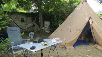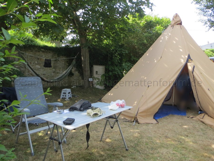 Absolut empfehlenswert: Der Campingplatz von Fécamp. Terrassenförmig angelegt, schnuckelige Mini-"Grundstücke", aber leider war unser "Grundstück" nicht Hängematten-tauglich. Glücklicherweise konnten wir gleich am nächsten Tag umziehen, so dass wir die Hängematte als zusätzliches Möbel im kühlen Schatten nutzen konnten: